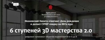 На данном курсе студенты рассматривают различные подходы к заработку на 3D визуализации и виртуальных технологиях. Пробуют создать свой сайт и рекламу для него. Выполняют ряд практических заданий для поиска первых клиентов как у себя в городе, так и в Интернете. Изучают специфику работы с заказчиками в данной сфере. Общаются с индивидуальными предпринимателями - директорами своих собственных студий, а так же с сотрудниками крупных Международных компаний!