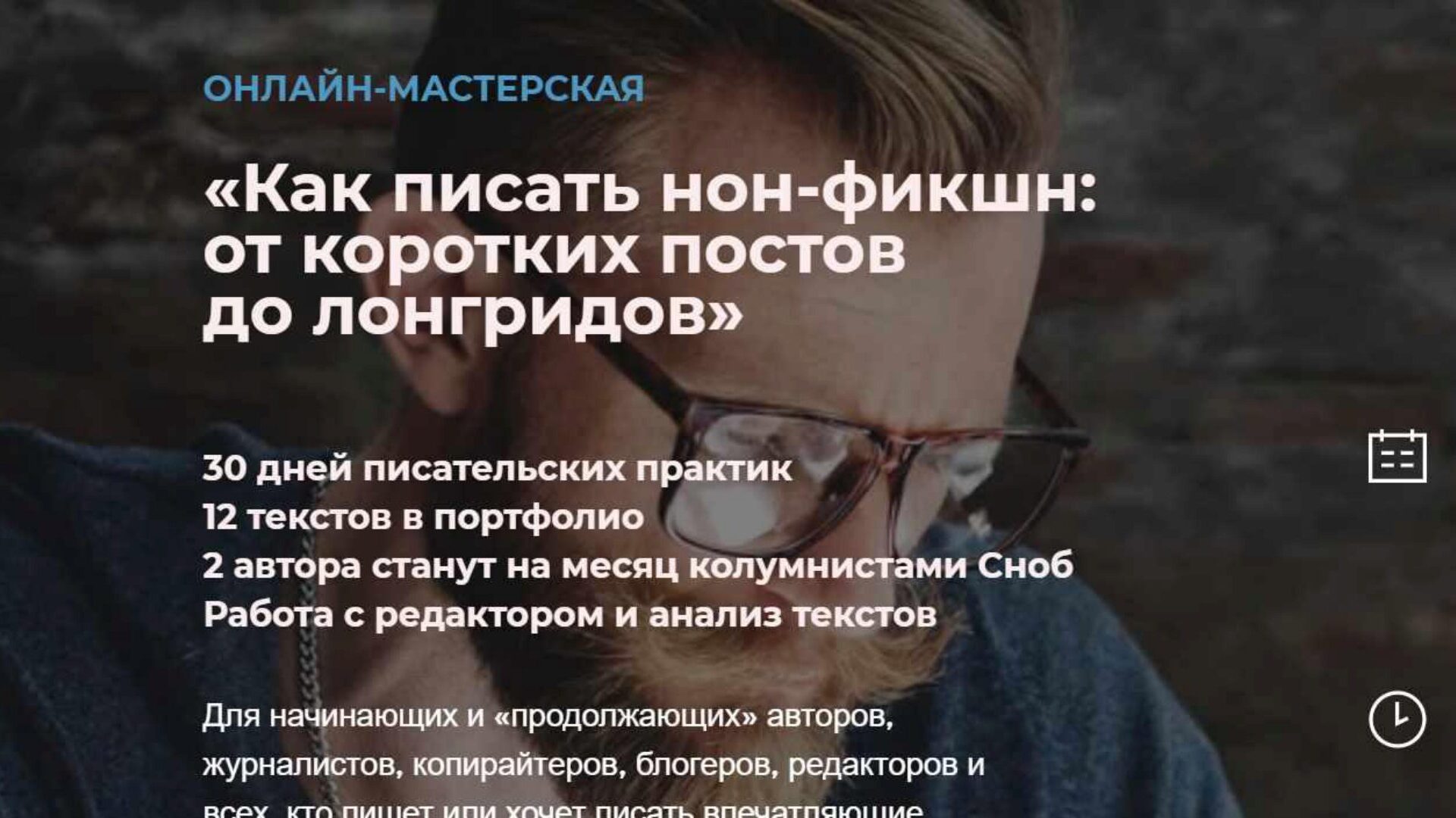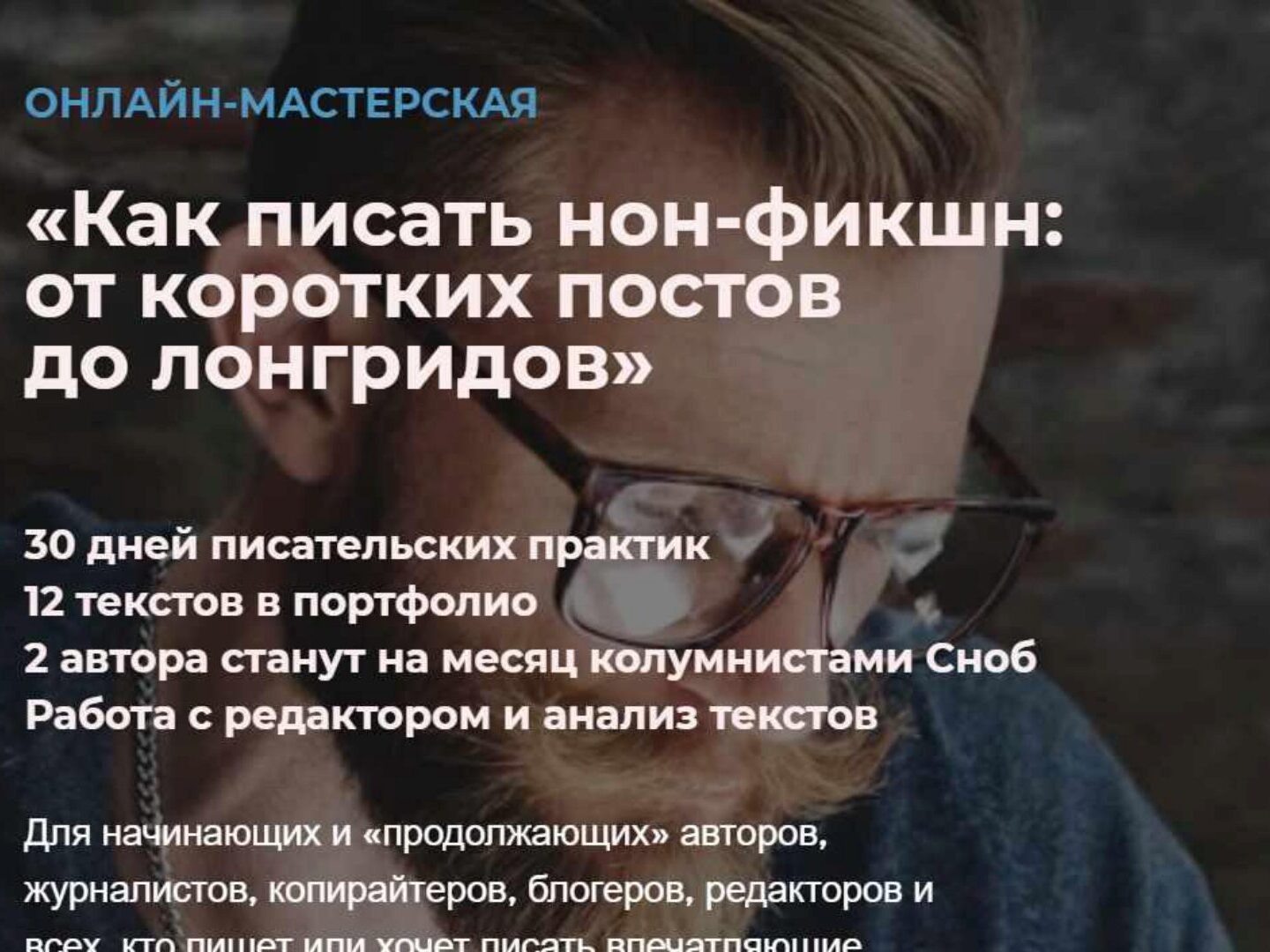 10 онлайн мастер-классов с еженедельными заданиями, которые проверяют профессионалы индустрии. Ваши наставники – авторы и редакторы крупнейших издательств и цифровых медиа: МИФ, Forbes, Yandex Zen и др. Вместе с ними вы пройдете путь от написания ультракоротких текстов до написания статей для СМИ, журналов и первой главы собственной книги.