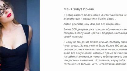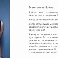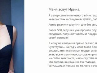 Ни дня без свидания. 2019 Ирина Черняк (airin_dates) Тариф «Я с Ирой» что мешает тебе Создать счастливые отношения? У тебя нет времени и желания ходить по ресторанам и клубам, чтобы знакомиться с мужчинами. Ты до сих пор пор боишься регистрироваться на сайте знакомств, не знаешь какой выбрать, как