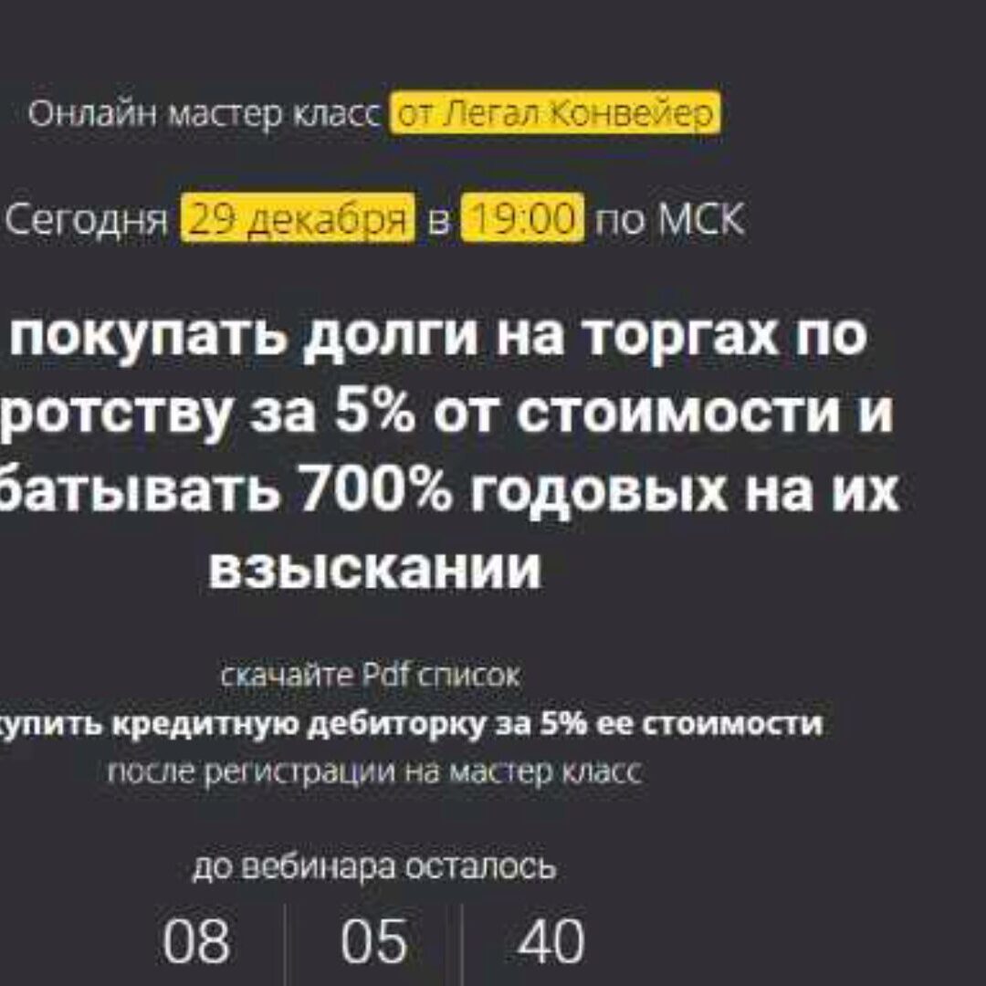 + расскажем как каждый участник может получить ссылки на сервисы по поиску и оценке дебиторки, а также конспект мастер класса как покупать и взыскивать дебиторку через приставов