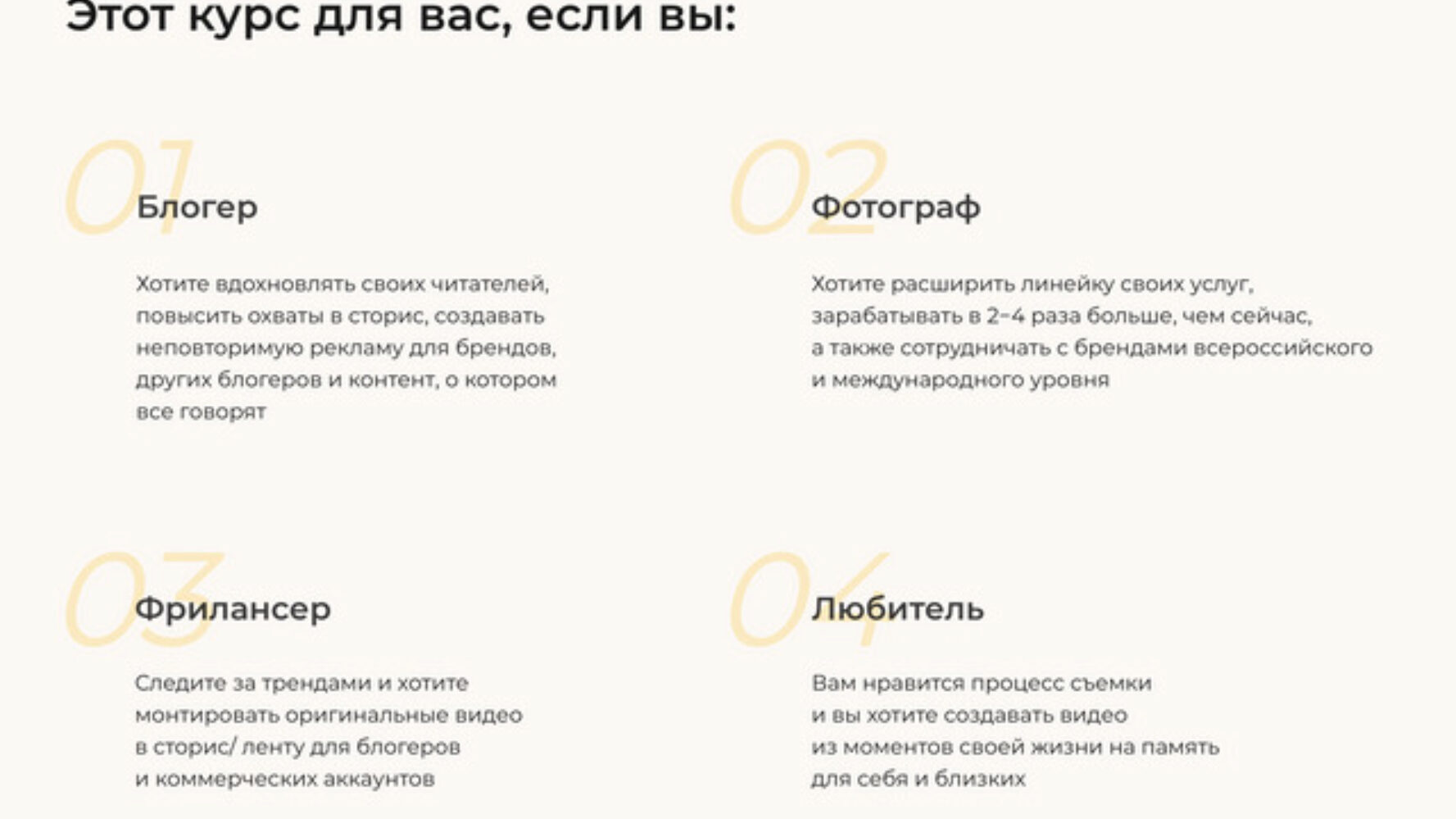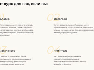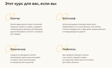 Почему этот курс - твоё идеальное решение? 16 видеуроков Практические уроки по съемке и монтажу видео с модными фишками и лайфхаками Результат через 1-2 дня Уже сегодня-завтра ты сможешь сделать крутой ролик и удивить своих подписчиков Неограниченный доступ к платформе Наши уроки находятся на