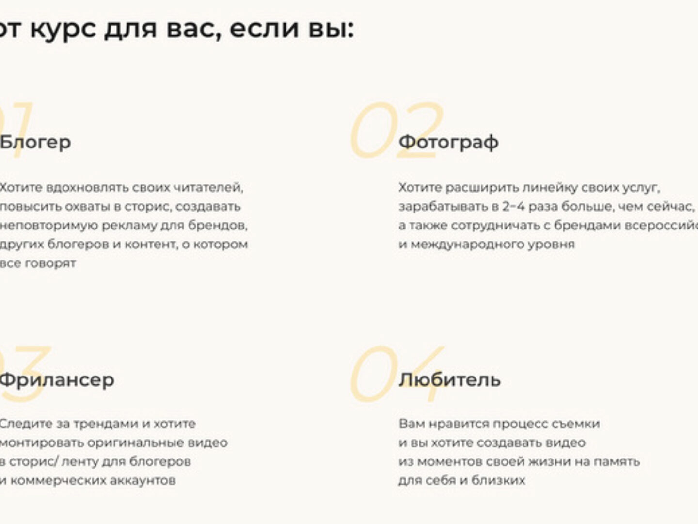 Кому будет полезен курс? Экспертам Новичкам Контент-мейкерам Предпринимателям Которые хотят проявляться в соцсетях и монетизировать свои знания Которые хотят зайти на видеоплатформу и быстро и легко набрать популярность Которые хотят привлечь новую аудиторию и вырасти органически Которые хотят
