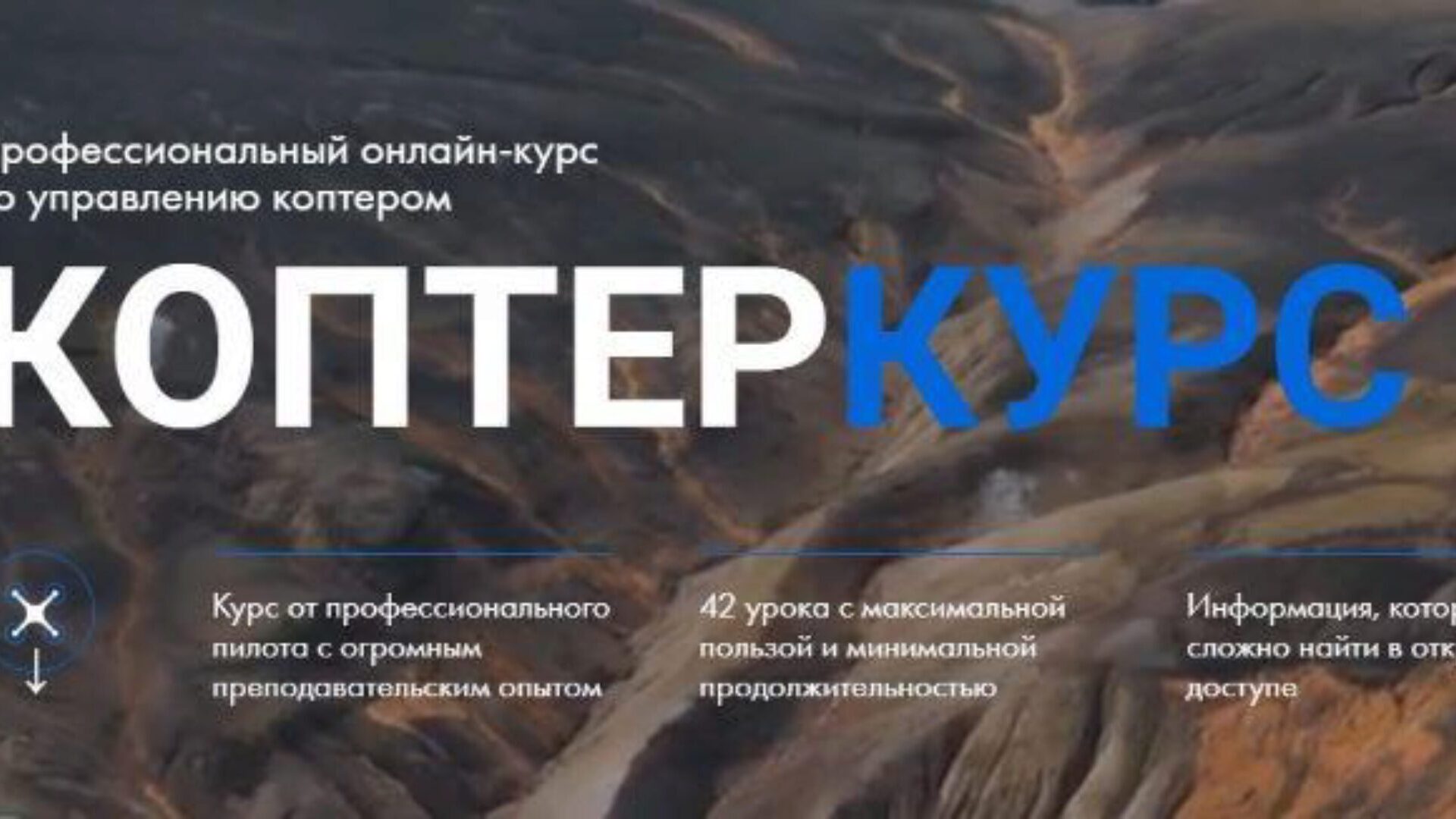 42 урока. 6 лет опыта в аэросъемке. Время прохождения курса: от 7 до 30 дней.