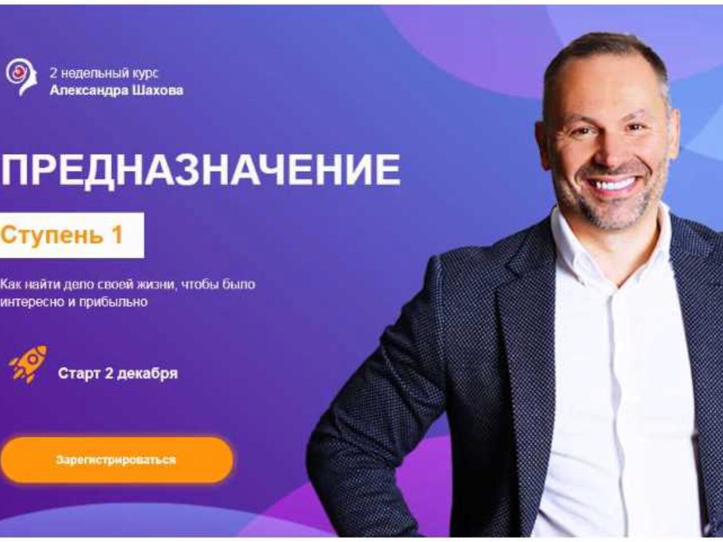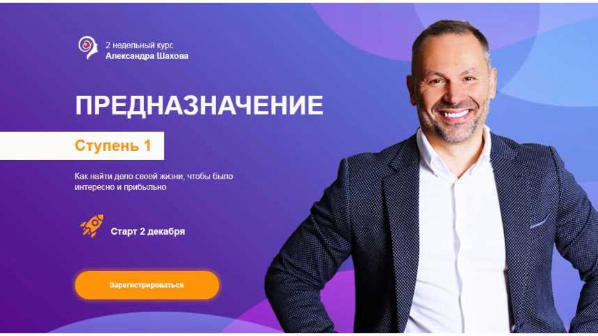 3-х недельный онлайн курс психолога Александра Шахова Как найти дело всей жизни и зарабатывать на нем во время кризиса предназначение - это... -Ваш вклад в жизнь других людей -Интересное и прибыльное дело -То, ради чего вы родились НА КУРСЕ ВЫ Узнаете чего хотите на самом деле Раскроете скрытые