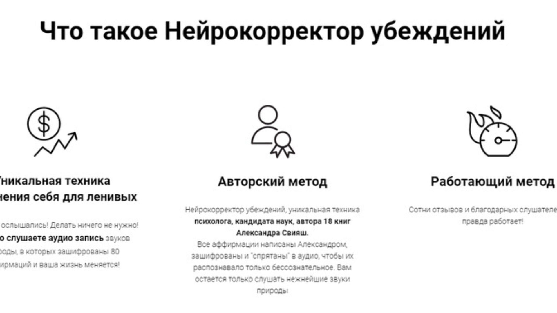 Что такое Нейрокорректор убеждений Уникальная техника увеличения дохода для ленивых Да, вы не ослышались! Делать ничего не нужно! Просто слушаете аудио запись звуков природы, в которых зашифрованы 80 аффирмаций увеличивающих доход... и он растет! Авторский метод Нейрокорректор убеждений, уникальная