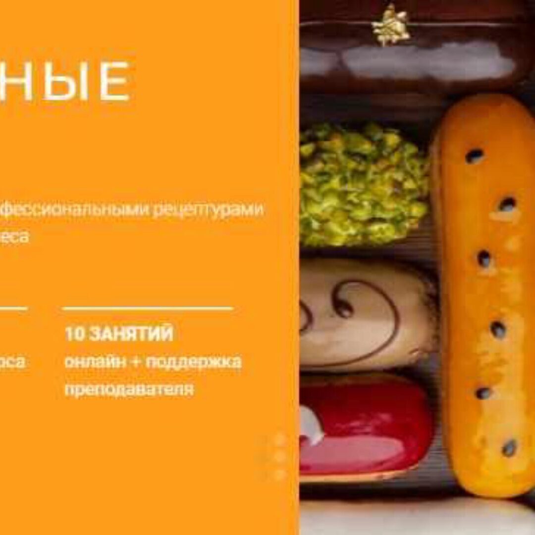 Обучение в формате прямой трансляции с возможностью приобрести доступ к записи. 3-4 мая «Взрослые эклеры». Эклеры со сладкими начинками и декором, с алкоголем в составе. Преподаватель Полина Егорова. 5 мая «Сытные эклеры» Эклеры с несладкими начинками и декором (овощи, птица, рыба, грибы).