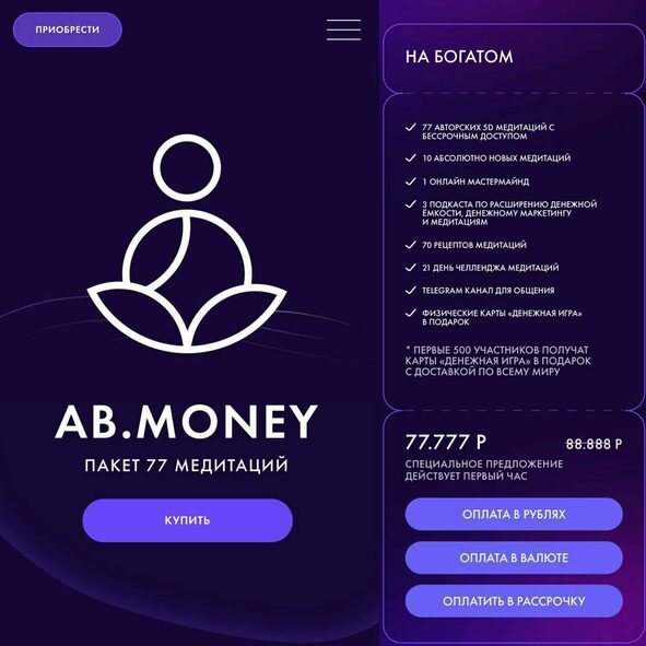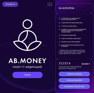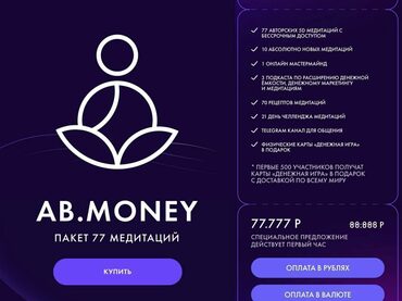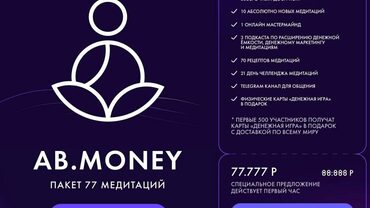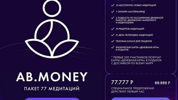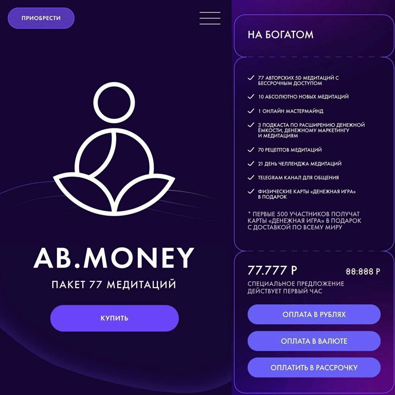 20 Новых авторских медитаций Совершенно новые медитации для курса AB.MONEY, которые станут вашими помощниками на пути к новой жизни. 5D Медитация пробуждения и выхода из матрицы Медитация Рода 2.0 Медитация перерождения Медитация исцеления себя Медитация расширения денежной емкости Медитация