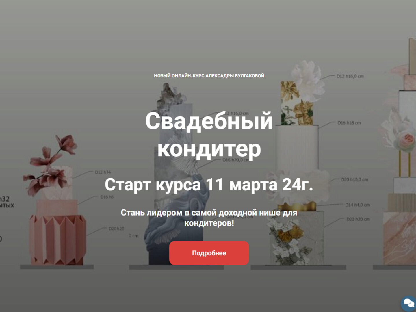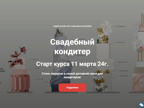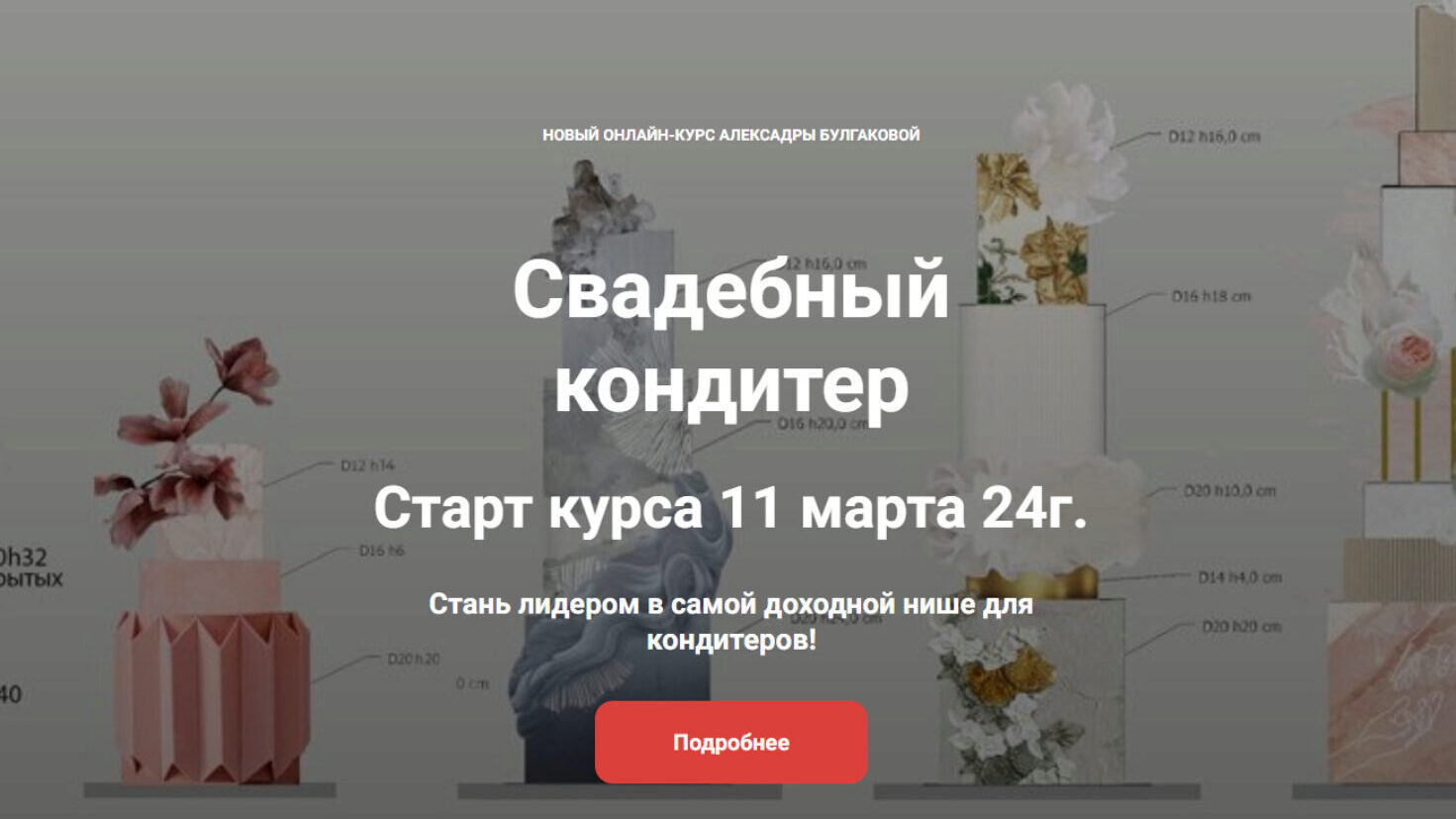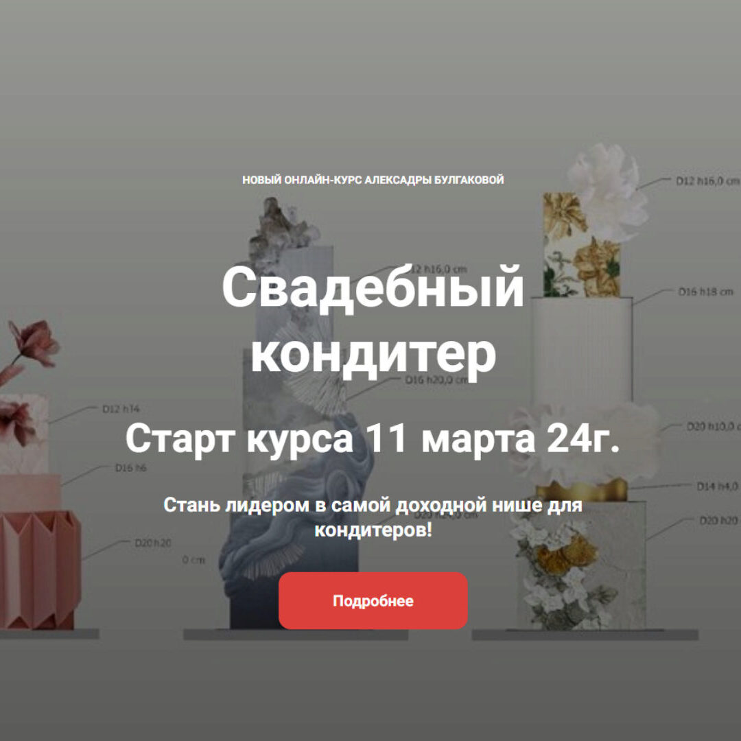 Самый подробный курс по свадебным тортам, множество техник, построение тортов разных конструкций с нуля. Работа с фальш-ярусами и межъярусами, обучение по выстраиванию личного бренда и выходу на сотрудничество в свадебной индустрии. ВЫ ОКУПИТЕ КУРС ОДНОЙ РАБОТОЙ А знания, которые получите на курсе