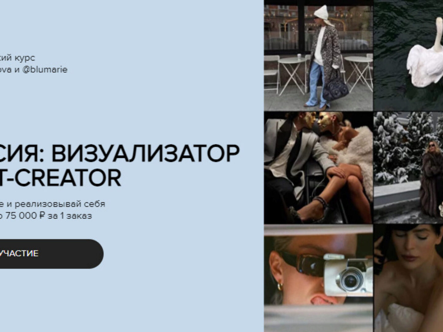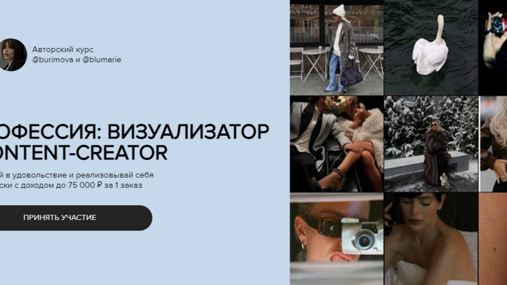 Создавайте визуальный контент для брендов, экспертов и блогеров на свой телефон и зарабатывайте от 10 000 до 75 000 руб. за 3 часа съемки ЗАЧЕМ НУЖЕН КРАСИВЫЙ ВИЗУАЛ? Визуал — это визуальный контент в онлайн-пространстве. Это внешний вид сайта, маркетплейса, соцсетей вашего клиента: его дизайн,