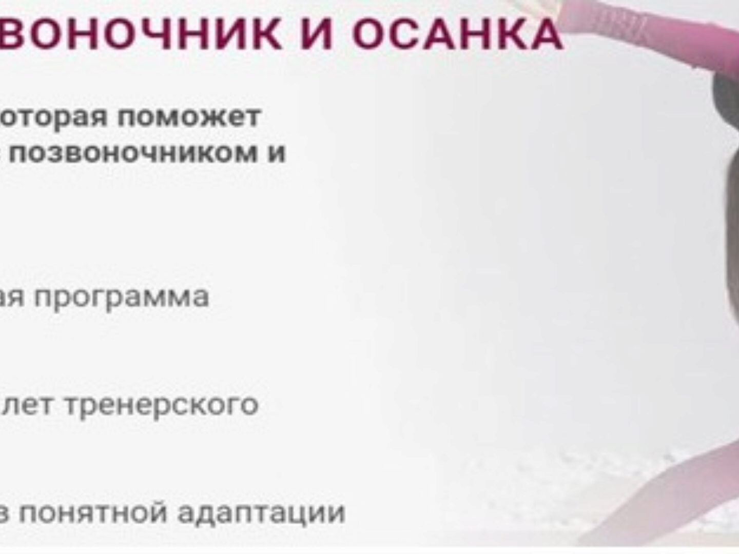 8-недельная программа, которая поможет понять причину проблем с позвоночником и осанкой и решить их авторская тренировочная программа Александры Кибзий лучшие наработки за 20 лет тренерского опыта современные методики в понятной адаптации ЭТОТ КУРС ДЛЯ ВАС, ЕСЛИ У вас бывают неприятные ощущения в