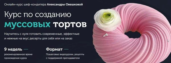 ХИТ ПРОДАЖ в CAKEPRO Знаменитые муссовые торты от Александры Овешковой! Обновленный курс МУССОВЫЕ ТОРТЫ 3.0 - Основы приготовления муссовых десертов с нуля. - 7 авторских рецептов с безупречным вкусом. - Технология поэтапной готовки и заморозки, с которой легко зарабатывать. 7 МУССОВЫХ ТОРТОВ 1.