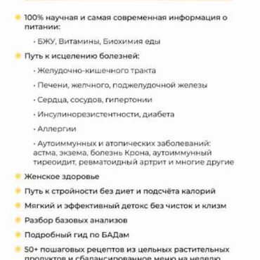 Хочешь быть здоровым, стройным, всегда иметь много энергии и продлить молодость? Я дам тебе знания и практические инструменты! Всего через 4 недели твоя жизнь изменится. Это будет легко и приятно. Курс подходит для всех не зависимо от типа питания Практические знания, которые приведут тебя к