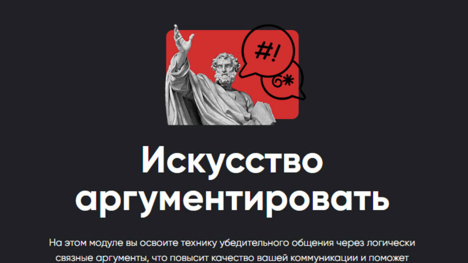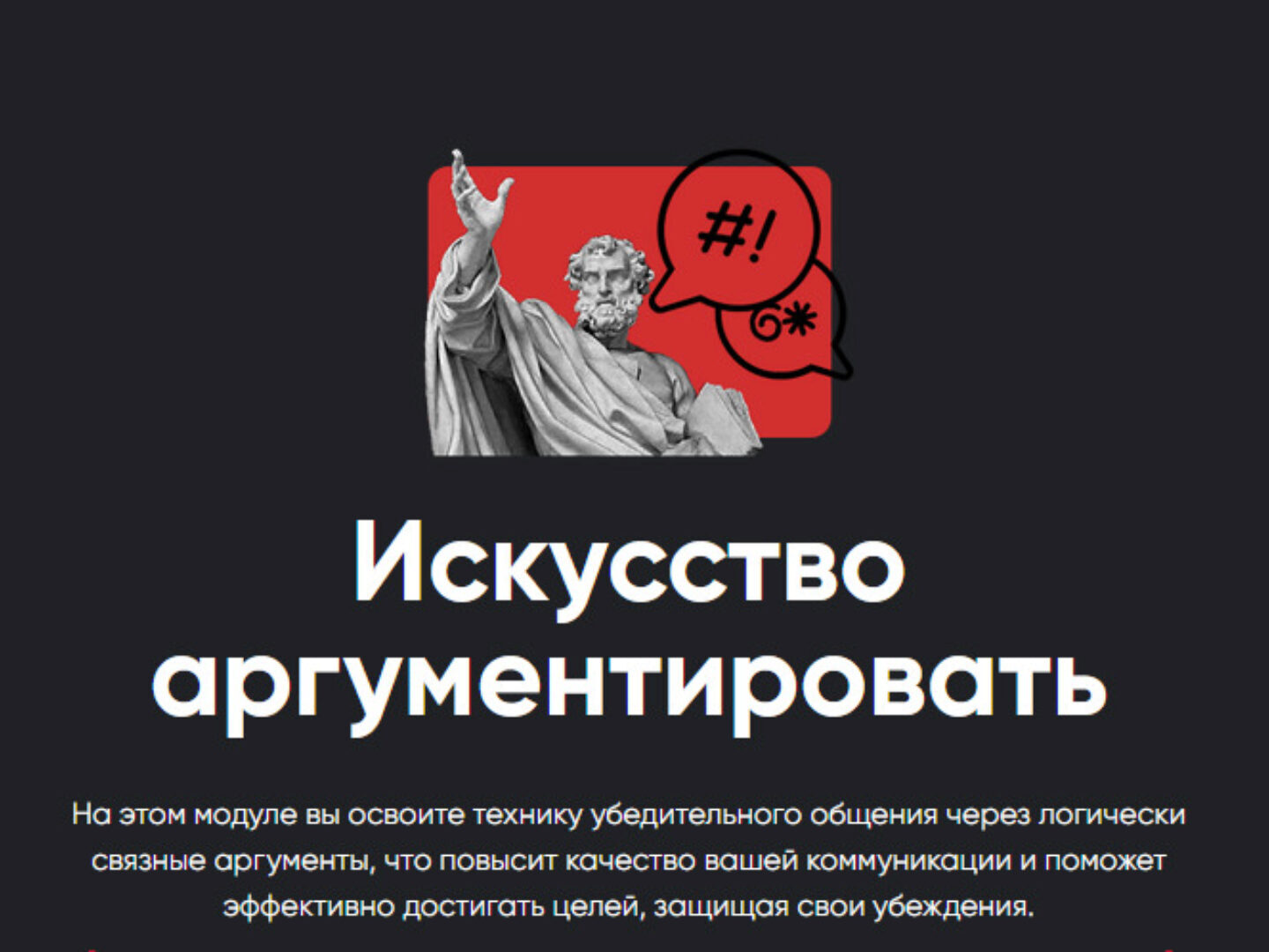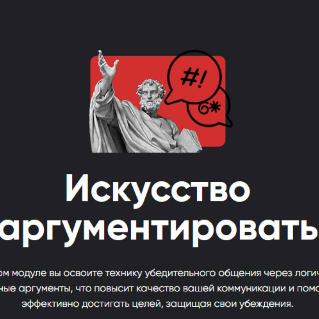 На этом модуле вы освоите технику убедительного общения через логически связные аргументы, что повысит качество вашей коммуникации и поможет эффективно достигать целей, защищая свои убеждения. «Искусство аргументировать» - авторский модуль Алексея Арестовича Модуль состоит из 6 занятий: Занятие 1 (