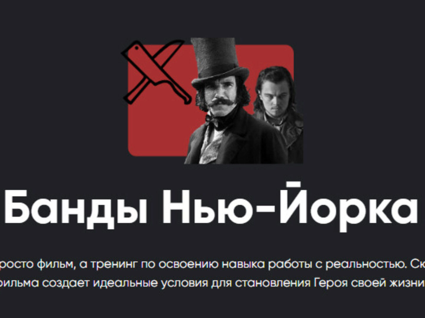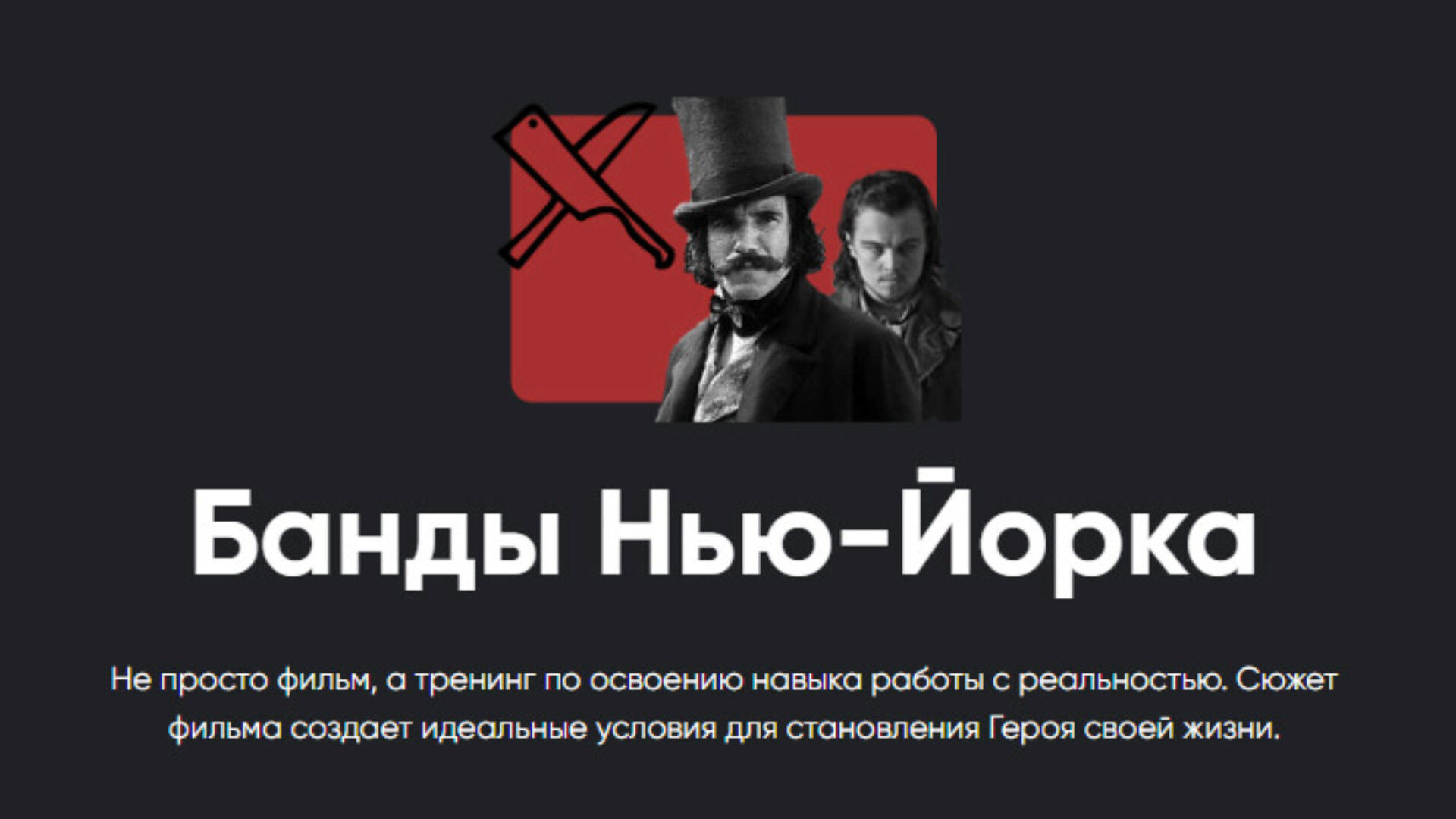 Харизматичнейший главный анти-герой (Дэниэл Дэй-Льюис), является буквальным воплощением этих принципов, кульминацией чего является то, что он сам вырезал себе один глаз, который посмел однажды опустить перед лицом своего противника. Сын этого противника (ди Каприо) пытается подобраться к главному злодею, чтобы отомстить, и параллельно — проходит у главного злодея полный курс уважения к реальности и честности с самим собой. Приглашаем вас к совместному просмотру фильма Банды Нью-Йорка, который является учебным материалом к семинару «Внутренняя честность. Часть 1» .