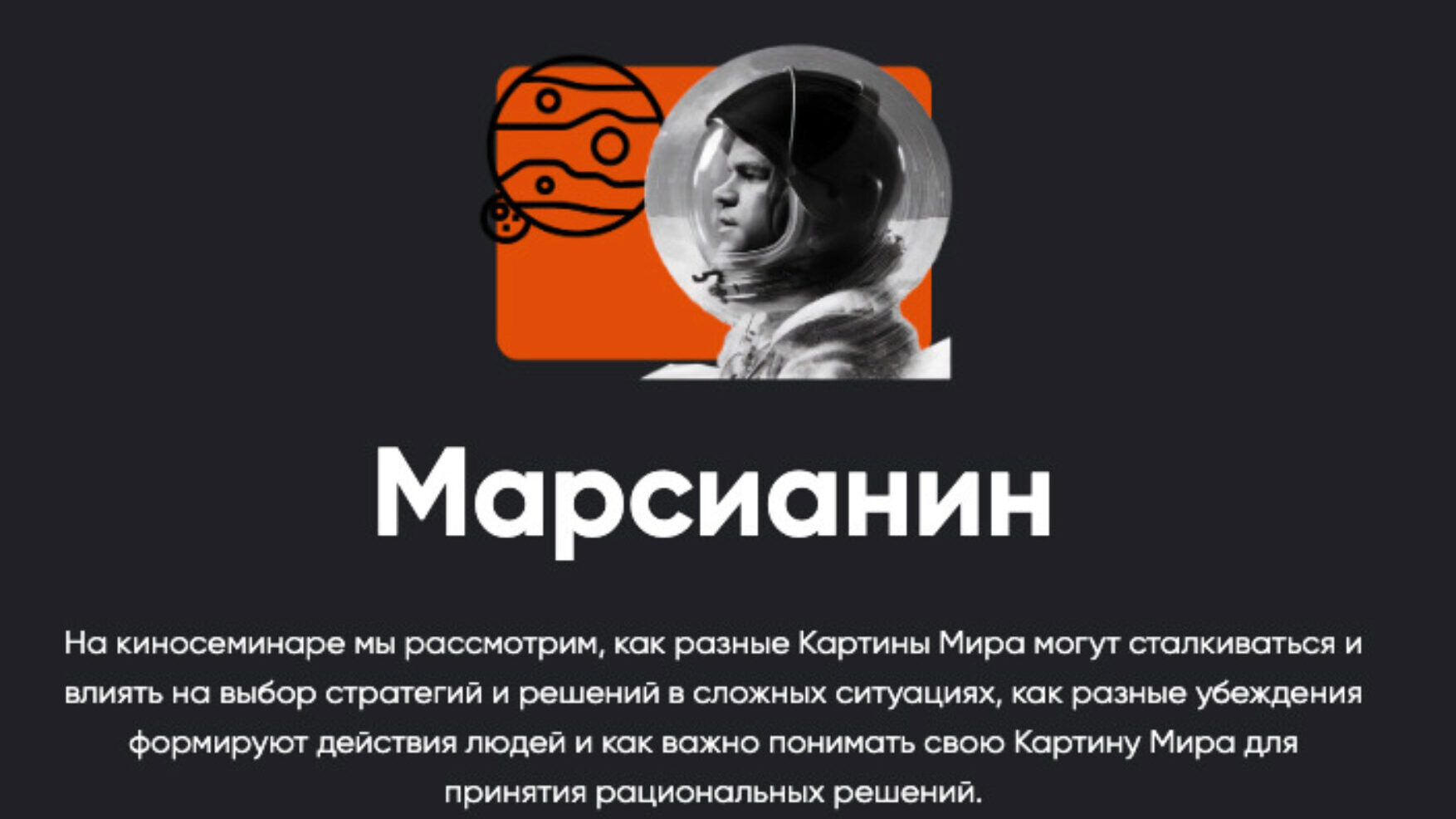 Для максимального погружения в занятие, рекомендуем заранее посмотреть фильм «Марсианин» (2015) режиссёра Ридли Скотта, с Мэттом Деймоном в главной роли.