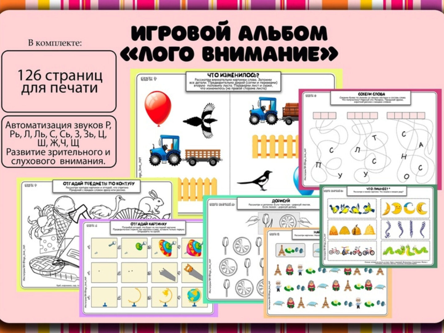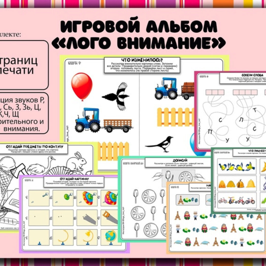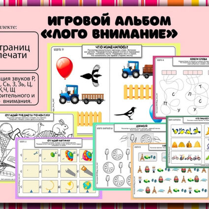 В альбоме 8 листов в формате А4. Речевой материал для звуков С-Ш, З-Ж, Р-Л, Рь-Ль, З-С, Ц-Ть, Ч-Ть, Щ-Сь, Р-Рь, Л-Ль, С-Сь, З-Зь. Никаких деталей для вырезания. Можно заламинировать, либо вставить листы в прозрачный файл, либо работать на распечатанных листах. Ход игры: Ребенок обводит графодорожку