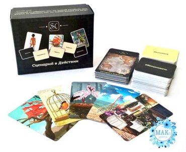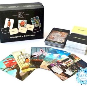 В колоде «Сценарий в действии» нет случайных изображений. Все рисунки объединены общей концепцией и созданы художником по специальному техзаданию. Колода состоит из 50 карт-картинок и двух наборов карточек-глаголов (по 130 шт. в наборе). Два набора карточек – это очень удобно при работе с 2 и более участниками. К колоде прилагается методическое пособие (36стр.) с небольшой теорией, консультативными примерами и вариантами раскладов.