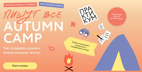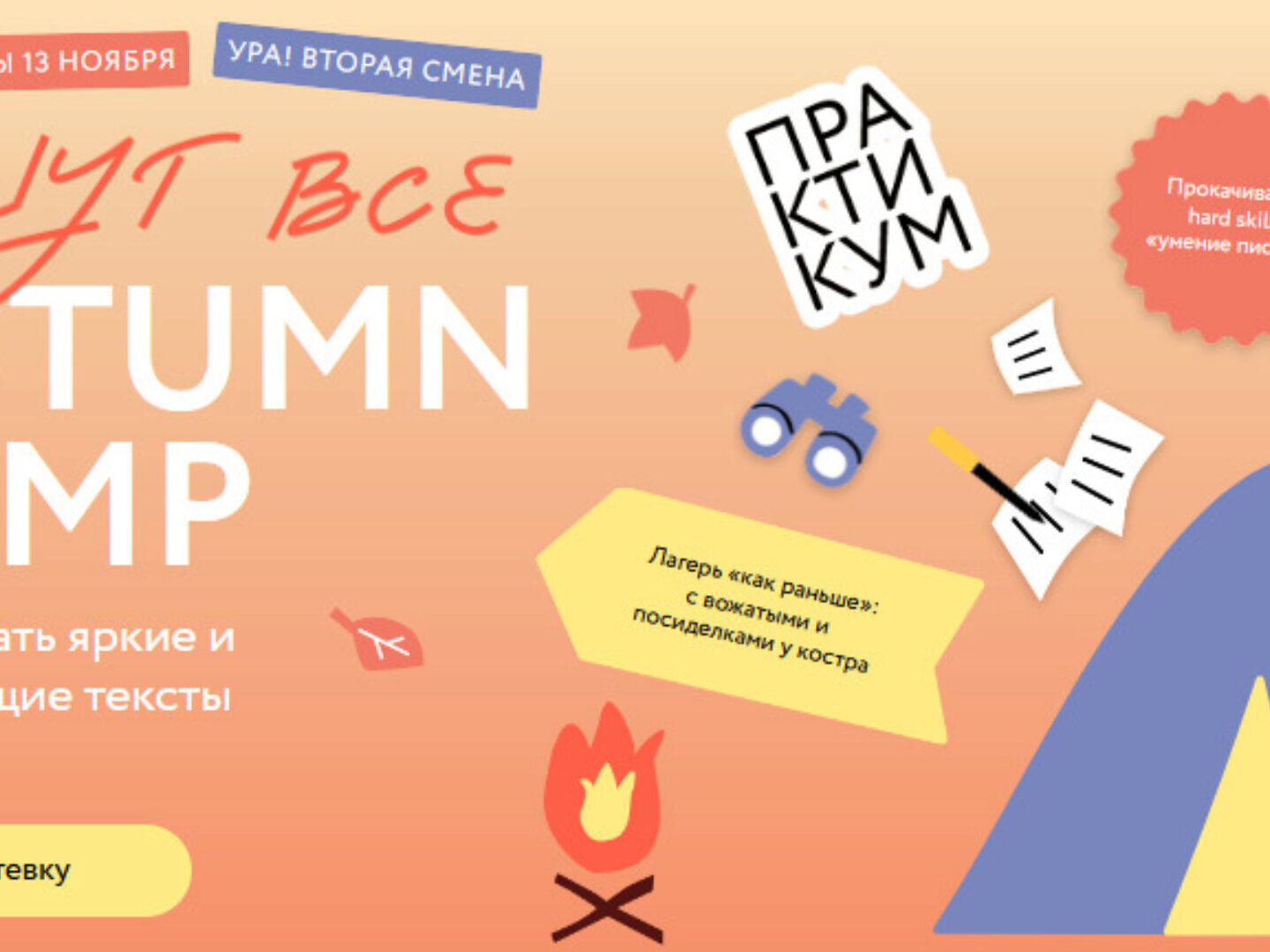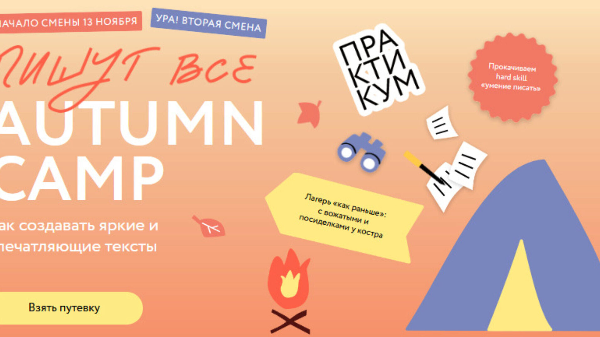Вас ждет классный формат — настоящего лагеря, как в детстве. Будут и веселые старты (преодолеем страх чистого листа), и зарядка (вдохновением), и купание в море (метафор).