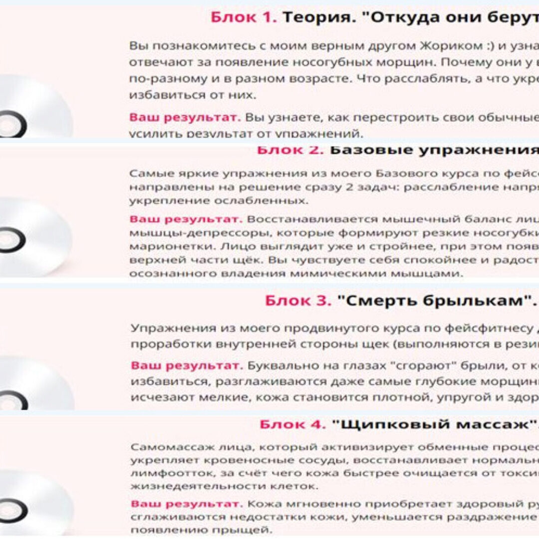 Вы получаете готовый комплекс упражнений, направленный на точечное решение конкретной проблемы за максимально короткий срок. Вам не нужно ничего искать в интернете и тестировать методики на себе, теряя время и терпение. Вы просто включаете видео и делаете упражнения вместе со мной.