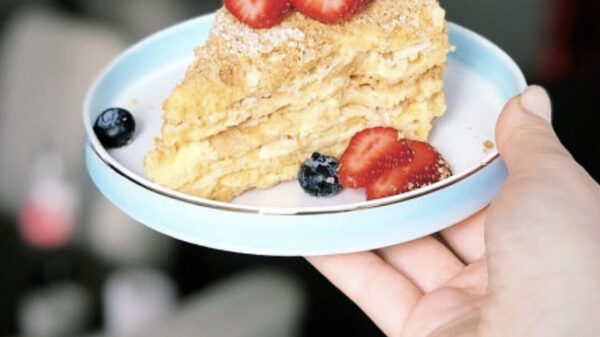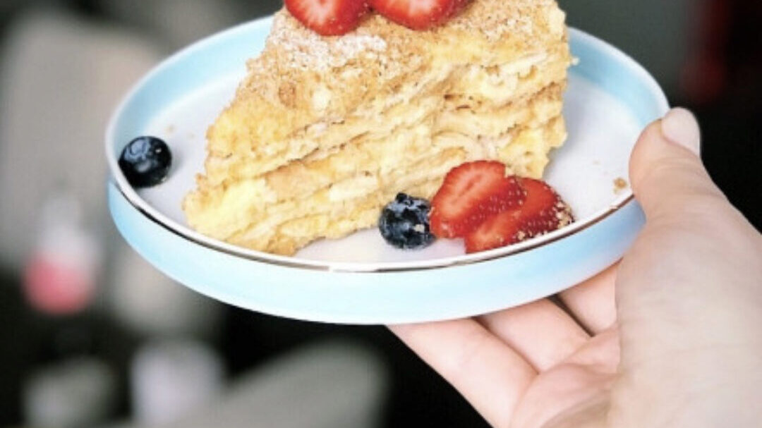 О десерте: много-много тончайших коржей из рубленного теста, нежнейший заварной крем с ванилью и нотками сгущённого молока, а сверху побольше свежей малины или клубники! В целом, торт готовится очень просто и не требует никаких «сложных ингредиентов», что делает его подходящим для любой хозяйки.