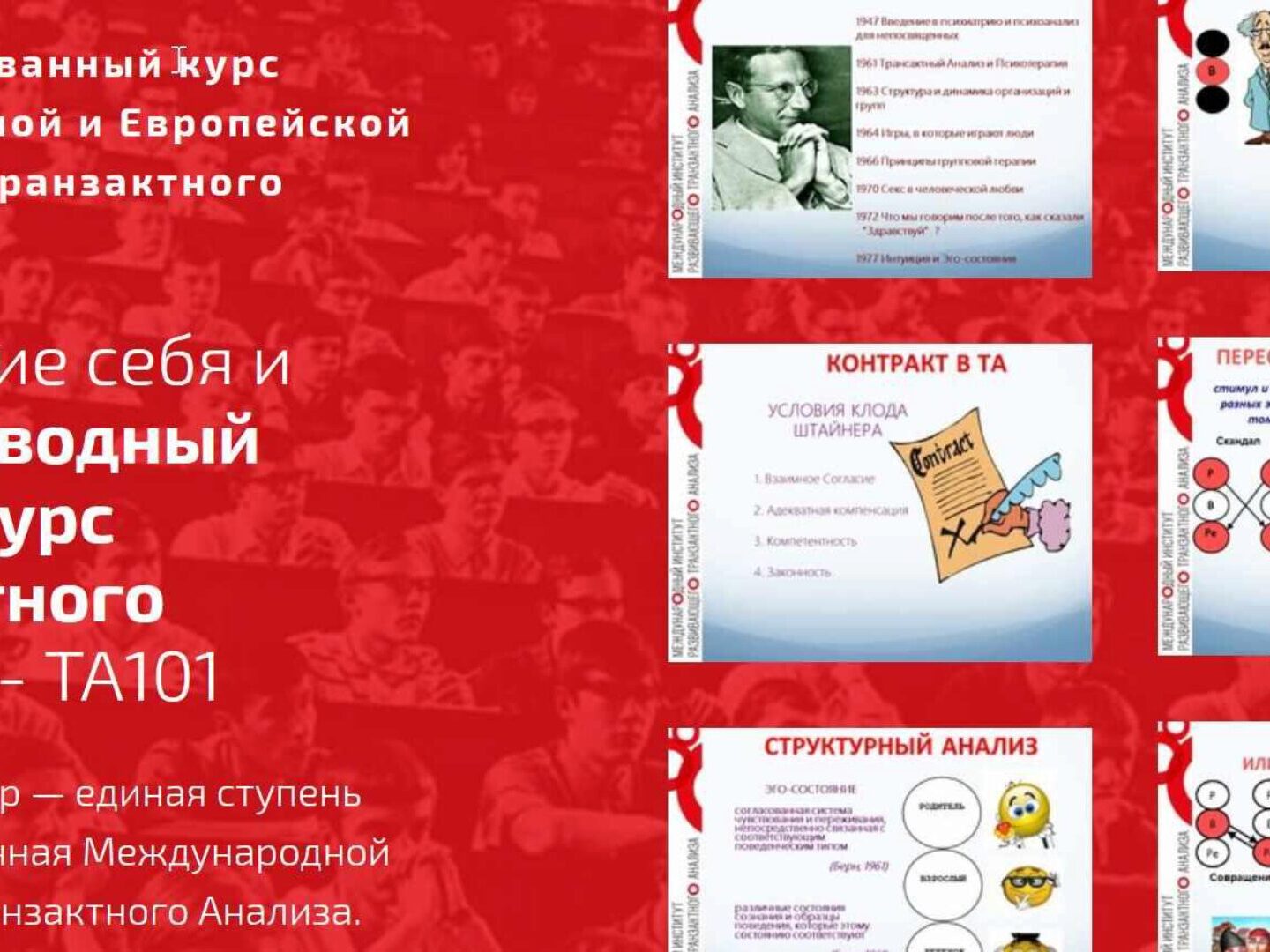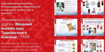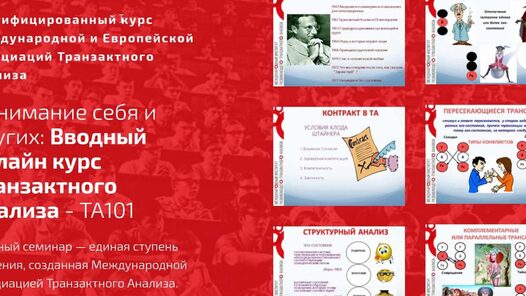 Транзакционный анализ (TA) — это модель, которая помогает понять поведение, отношения и коммуникацию между людьми. Он был первоначально разработан в 1950-х годах Эриком Берном. Вводный курс посвящен теории транзактного анализа, в том числе структуре личности; транзакциям или тому, как мы относимся к другим; структурированию времени; психологическим «игры», в которые мы играем; и жизненным сценариям. Участники курса получат возможность опробовать полученные знания в упражнениях, а также потренировать навыки в общении с другими.