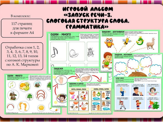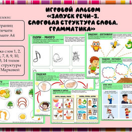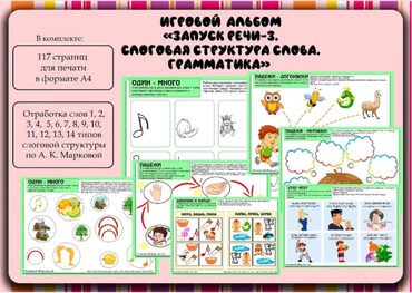 ПРОДОЛЖЕНИЕ Большой игровой альбом. Запуск речи-4. Слоговая структура слова. Творчество. 🟢14 типов ССС 110 страниц для печати 🟣Огромный лексический словарь 🟠Клеим, лепим,вырезаем, рисуем, используем природный материал. Речь, моторика, воображение, мышление и фантазия!!