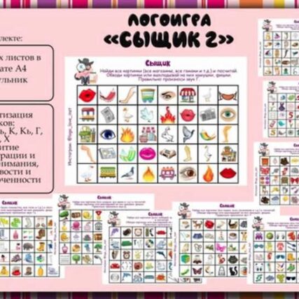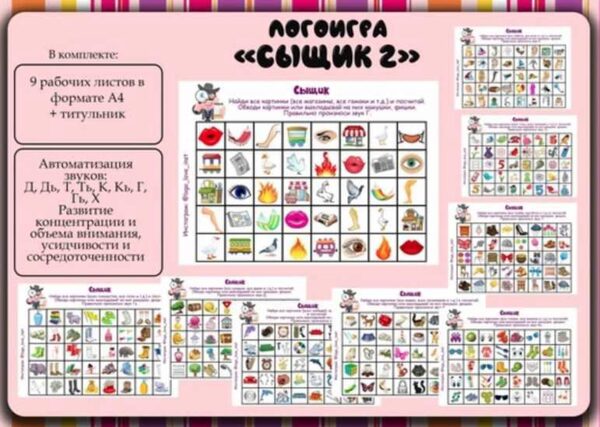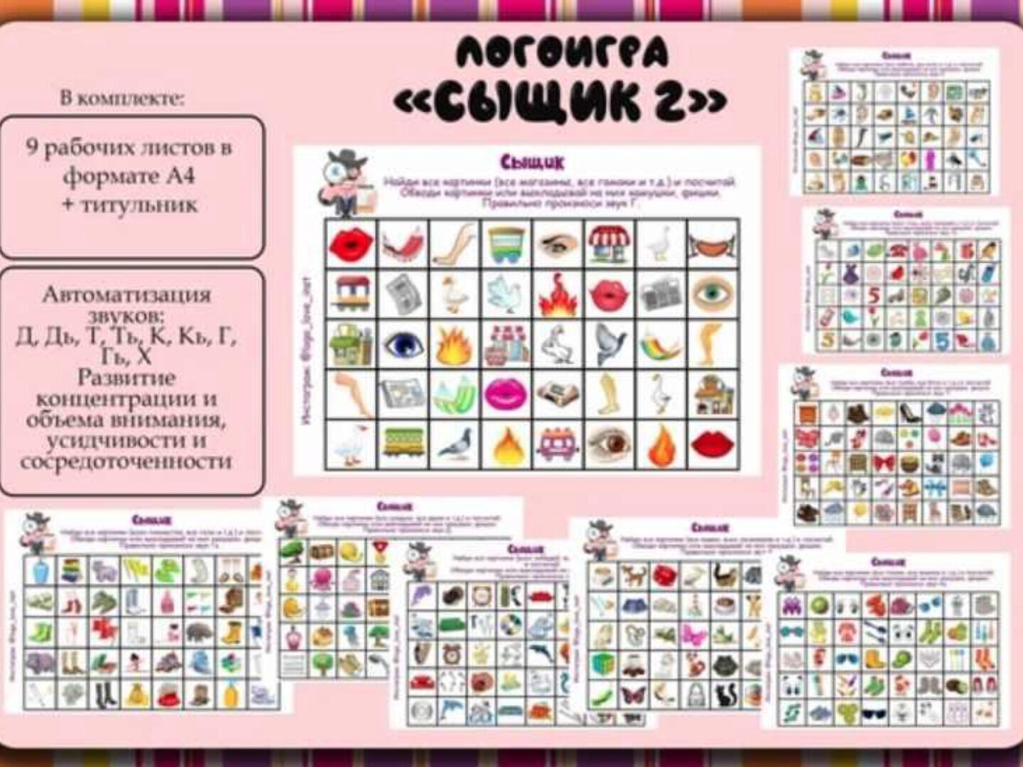 Логоигра «Сыщик» 13 рабочих листов в формате А4 + титульник Автоматизация звуков Р, Рь, Л, Ль, С, Сь, З, Зь, Ц, Ш, Ж, Ч, Щ. Развитие концентрации и объема внимания Развитие усидчивости и сосредоточенности Никаких деталей, распечатай и играй