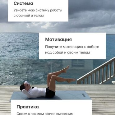 ЧТО БУДЕТ НА КУРСЕ 10 Коротких зарядок на все тело 30 Минут — среднее время одного комплекса 5 Занятий в неделю 20 Основных комплексов и тренировок Все комплексы сняты в красивых локациях на Мальдивах. ЧТО ВХОДИТ В ТАРИФ С КУРАТОРОМ: 20 комплексов и тренировок 4 недели 9 коротких-зарядок (+ бонус
