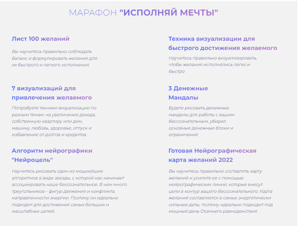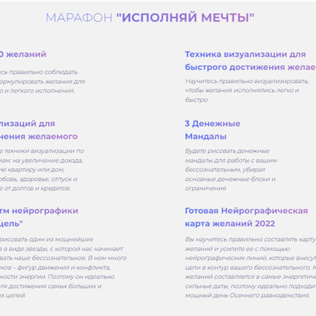 Марафон стартует 12 сентября – чтобы вы успели разобраться во всех тонкостях подготовки листа желаний и нейрографической карты желаний и подготовить всё необходимое для ее создания. Нейрографическую карту желаний нужно составить 23 сентября – в день, когда наступит Осеннее равноденствие, когда все