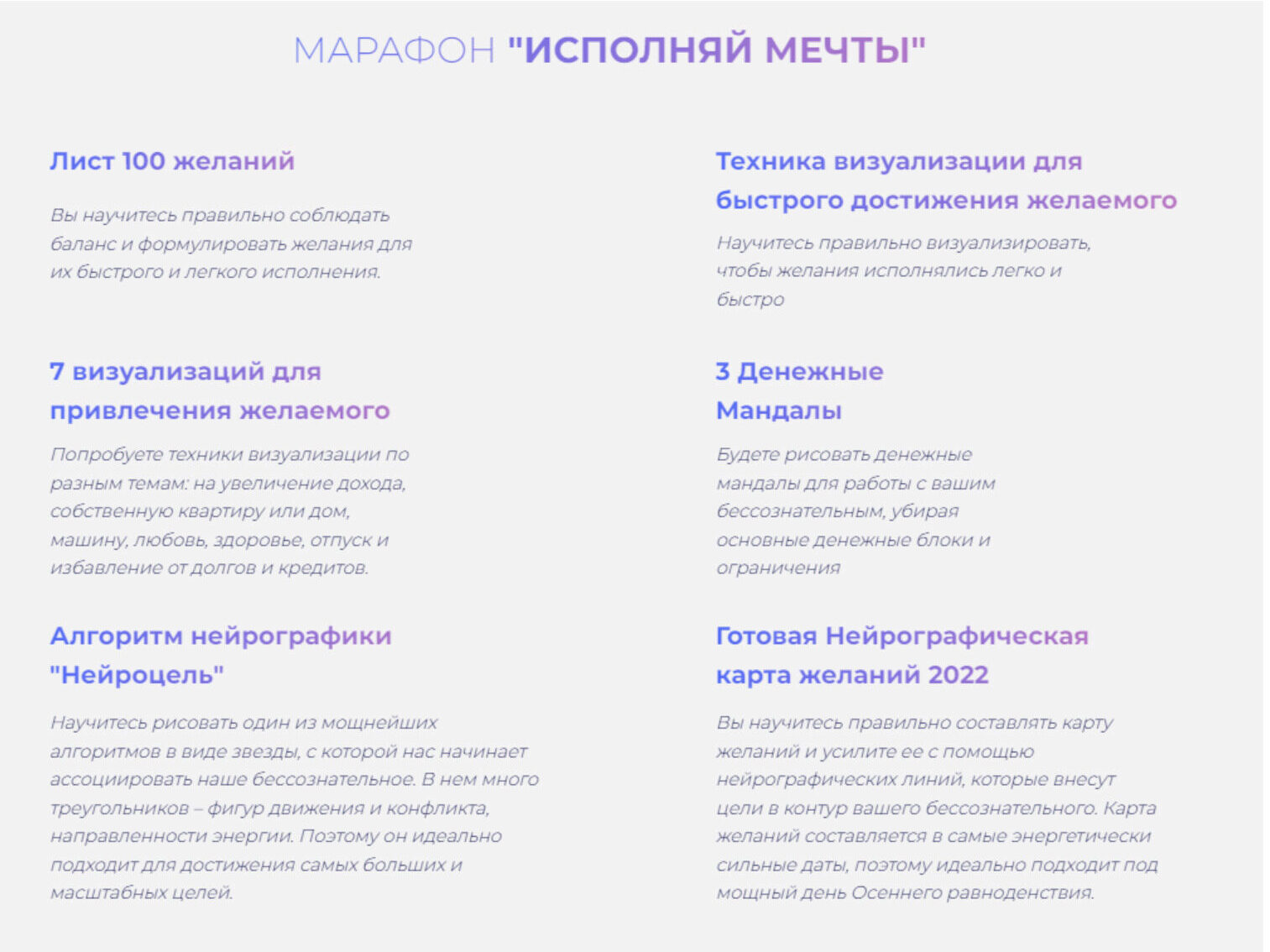 Что даст марафон «Фейерверки»? Переведёте свои мечты в разряд целей. Начнете не просто мечтать, но и действовать Получите энергию для достижения своих желаний Сможете достигать одновременно сразу несколько важных для вас целей Получите поддержку от Мира на пути к вашим самым смелым желаниям