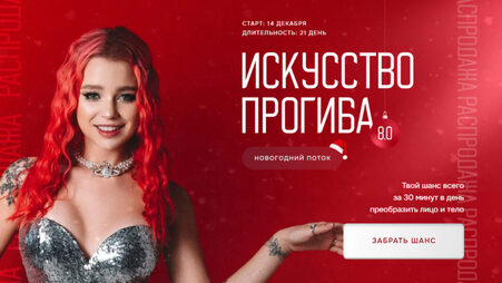 Тариф Результат 0. Вводный блок 1. Тренировки на ягодицы 2. Тренировка на верх 3. Лекция 1. Как не бросить тренировки спустя пару дней 4. Тренировка на ягодицы 5. Тренировка на верх 6. Программа «Все шпагаты за месяц» 7. Тренировка на ягодицы 8. Тренировка на ягодицы 9. Фейсбилдинг «Шикарное лицо