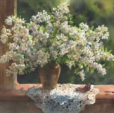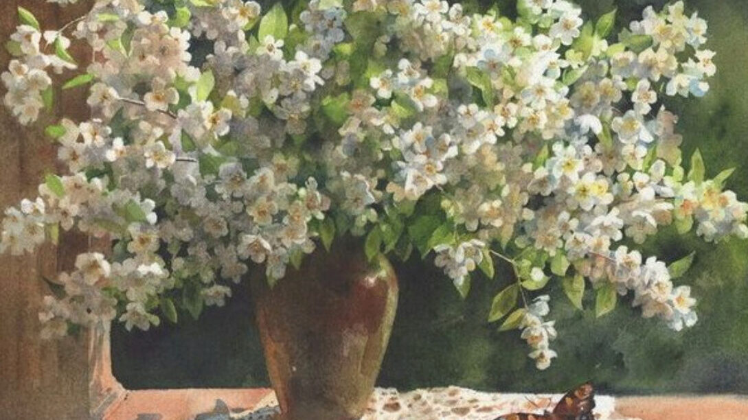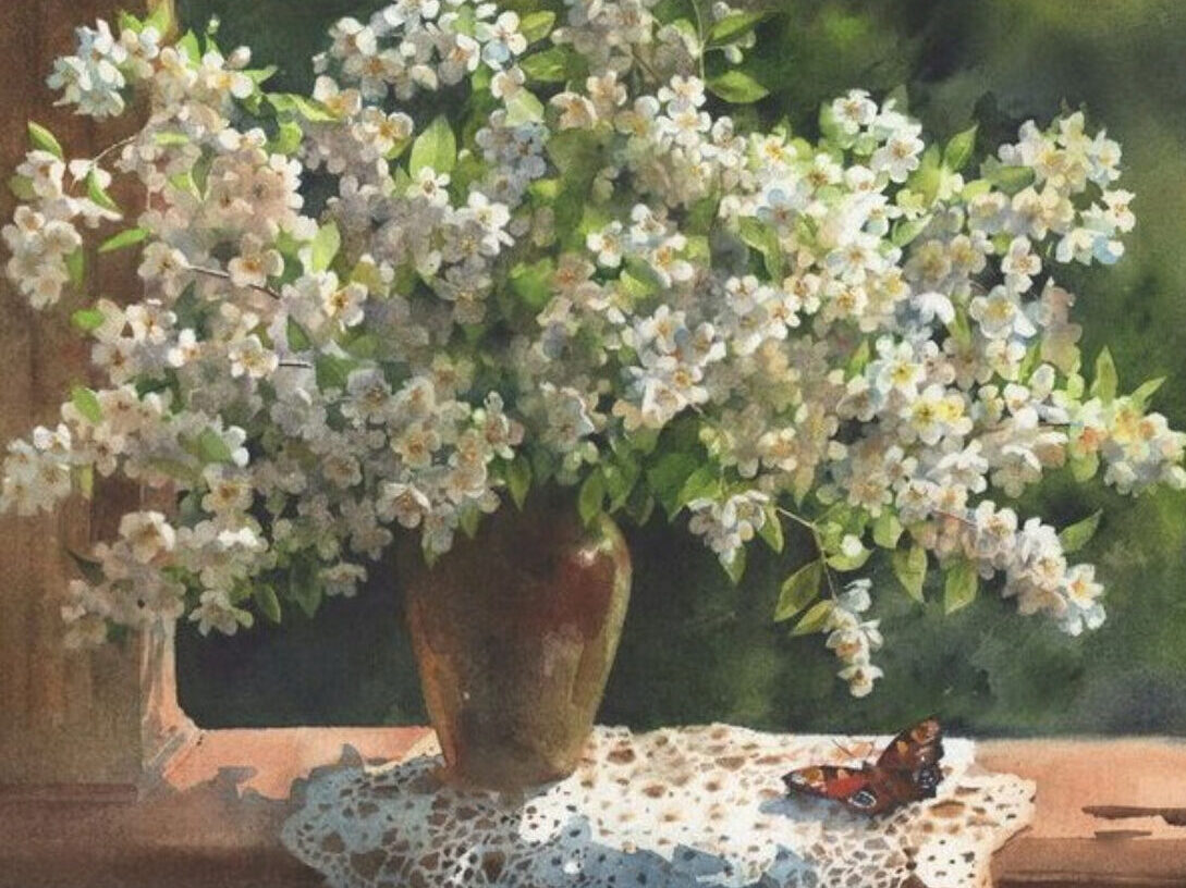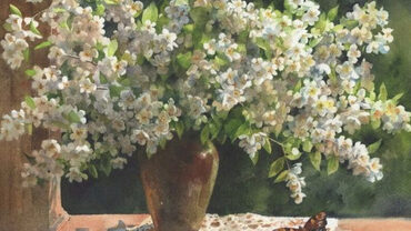 В основное время урока напишем акварелью пышный букет жасмина, подсвеченный весенним солнцем. Узнаем, как в изображении букета избежать излишней детализации: как выделять главное и как уводить внимание зрителя от второстепенных деталей. Поработаем над ажурной салфеткой: поймем, как написать белое кружево легко и без грязи.