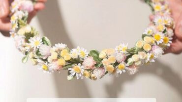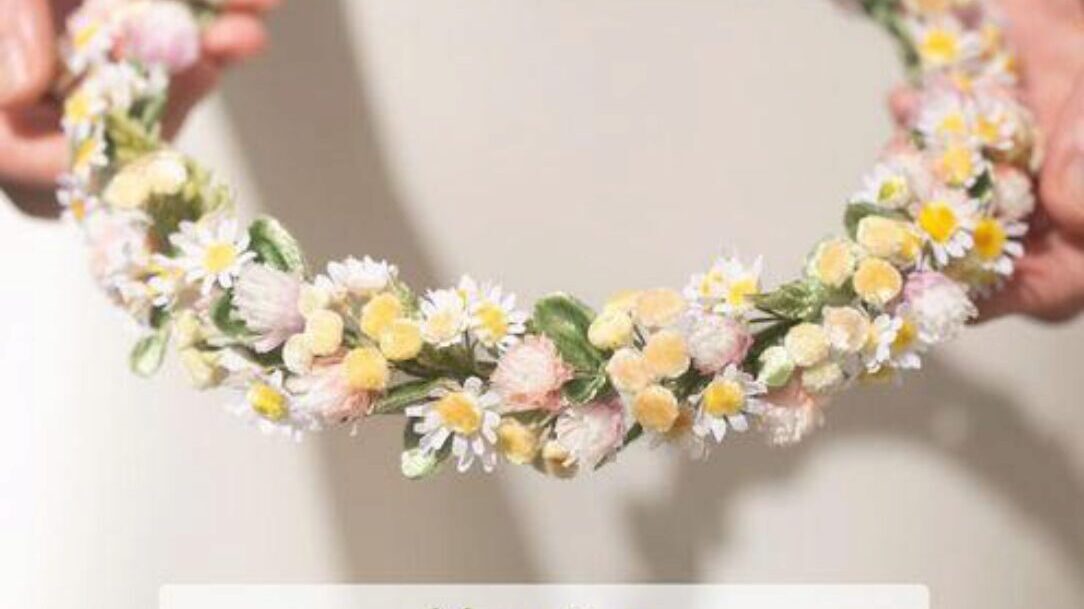 В венке и броши четыре вида цветочков - ромашка, пижма, клевер и короставник, а также два вида листочков.