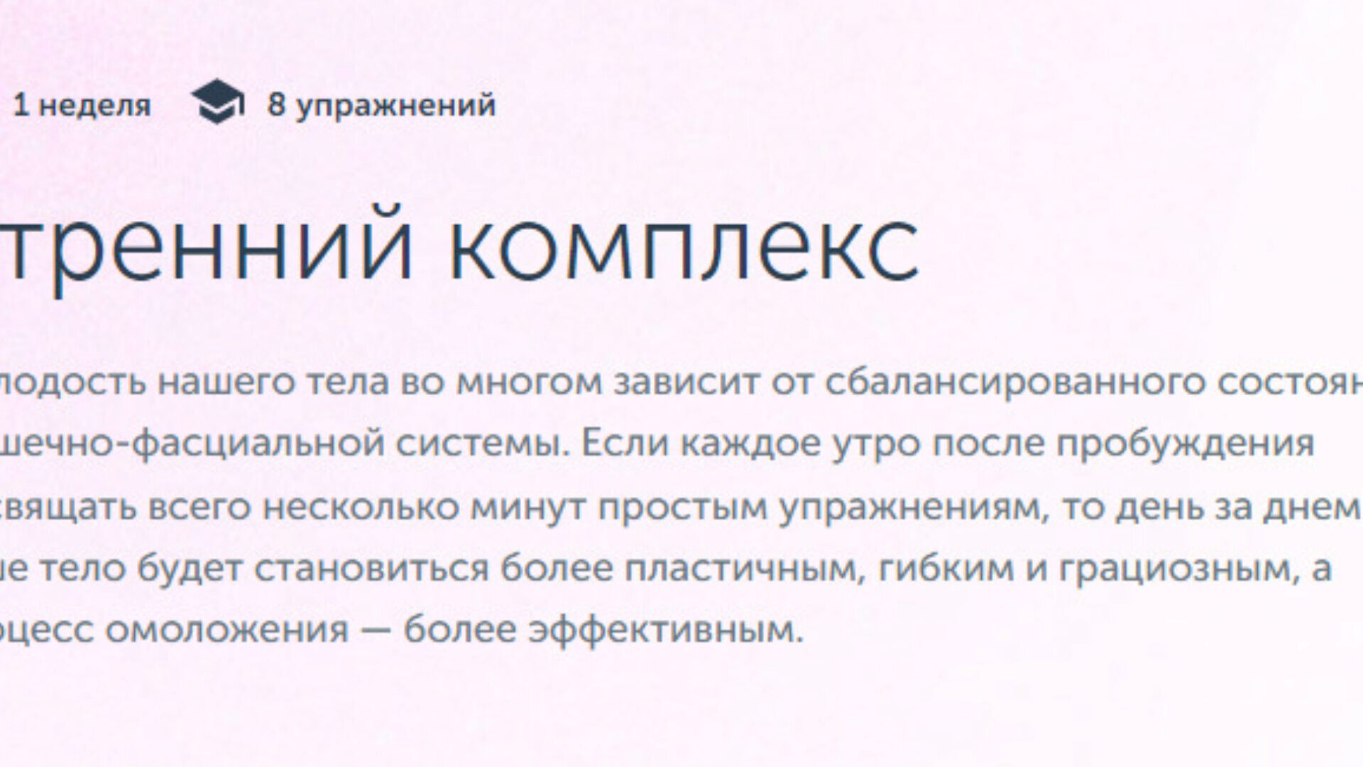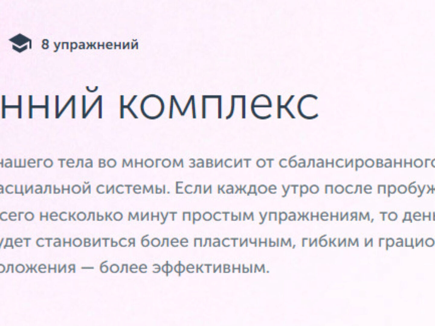 Это не просто комплекс упражнений для тонуса и хорошего самочувствия, но и активация мышечных цепей, выравнивание фасциальных связей, что способствует освобождению тела от блоков хронического напряжения и лучшему скольжению мышц относительно друг друга.