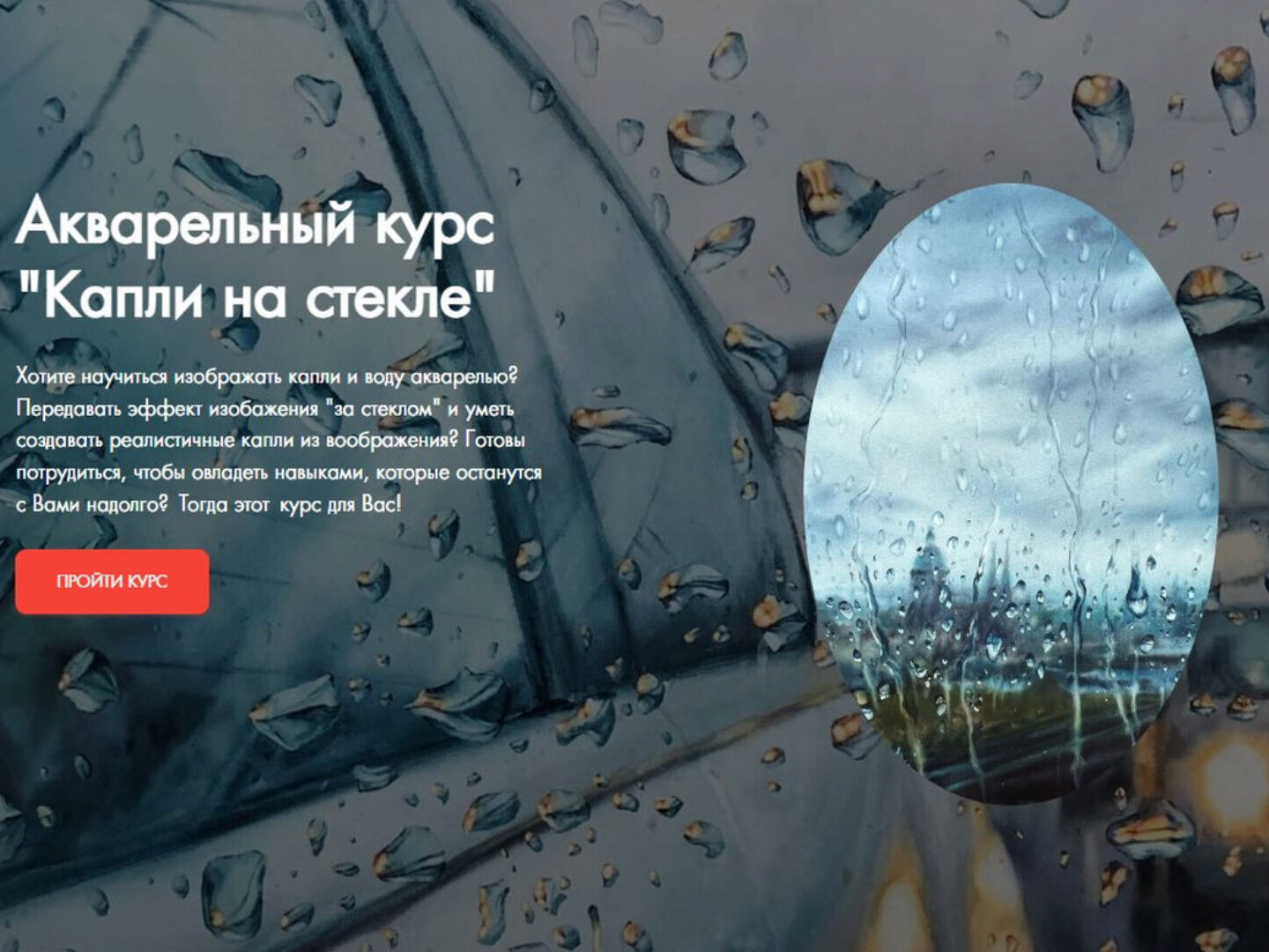 Во время курса помимо акварельных приемов и техник Вы узнаете какие бывают типы капель, как выглядит их структура, форма, как меняются в них отражения, чтобы после курса Вы могли бы реалистично придумывать свои собственные капли и успешно применять все полученные навыки на самостоятельных акварельных работах.