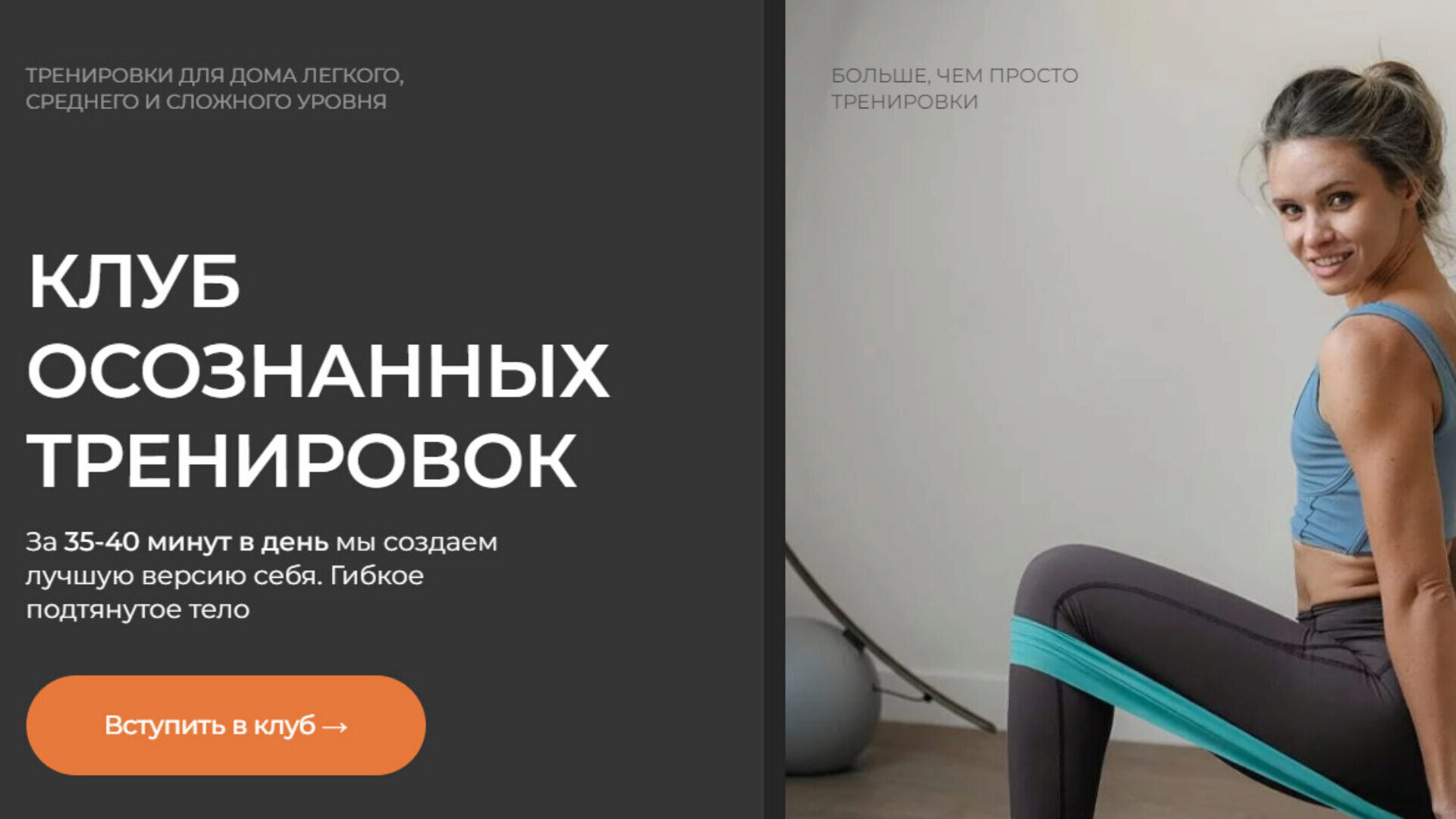 Клуб Осознанных Тренировок - система, которая дает результаты Создайте тело своей мечты. Тренировки любого уровня сложности, безопасные для суставах Стройное и здоровое тело за 40 минут в день. Это фитнес-клуб у вас дома, в котором никогда не скучно. 1000 человек ежедневно тренируется вместе