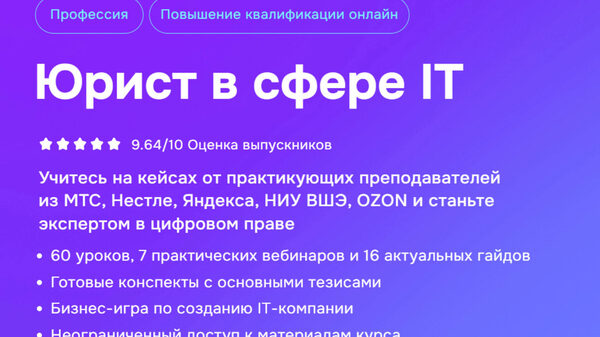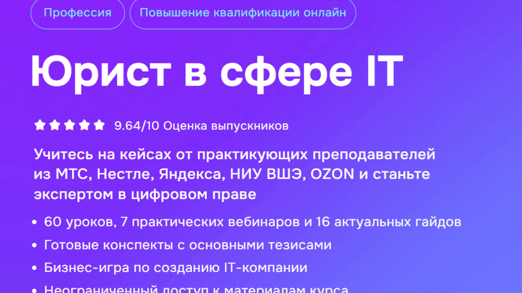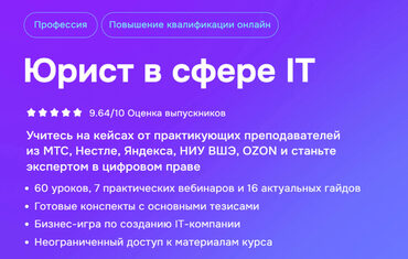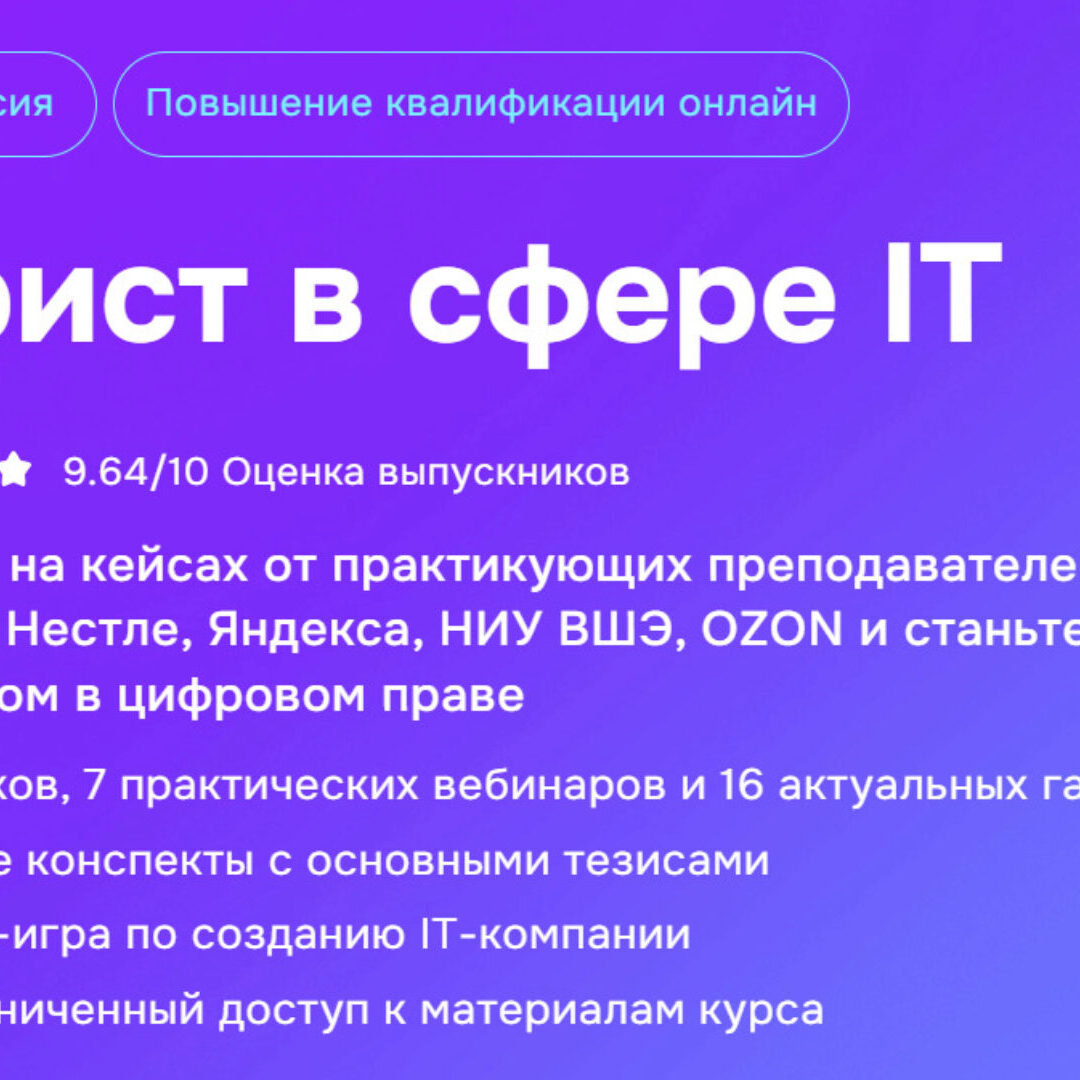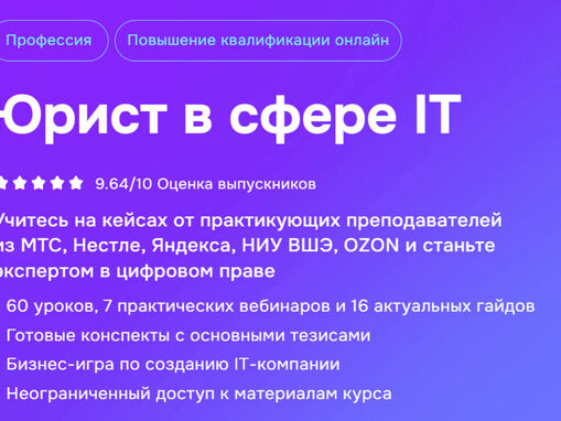 На курсе вы станете экспертом в цифровом праве и сможете участвовать в разработке и юридической защите новых технологичных продуктов. Цифровое право будет совершенствоваться, а ваша ценность — расти.