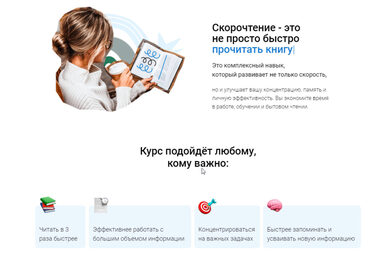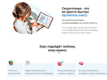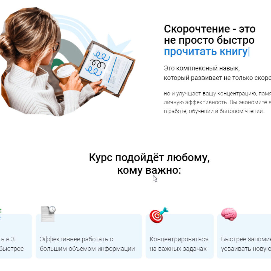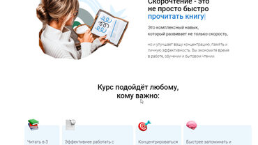 Что вы получите на курсе «Суперчтение»: 1. Увеличение скорости от 2 до 6 раз На этой скорости вы будете читать без потерь данных при чтении и использовать её всю жизнь. 2. Развитие памяти при чтении Вы научитесь хорошо запоминать прочитанные тексты на любой скорости чтения. 3. Улучшение