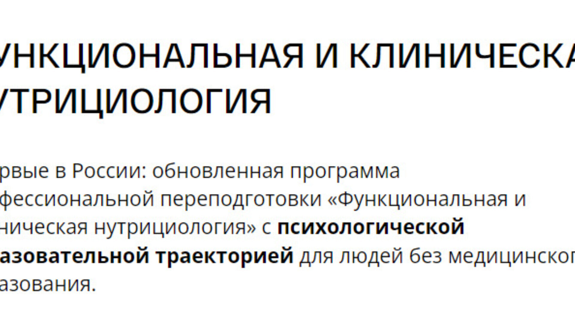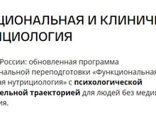 Функциональная и клиническая нутрициология Первая в России образовательная программа профессиональной переподготовки по функциональной и клинической нутрициологии для лиц без высшего медицинского образования Функциональный нутрициолог: Помогает с комплексным восстановлением здоровья, молодости и