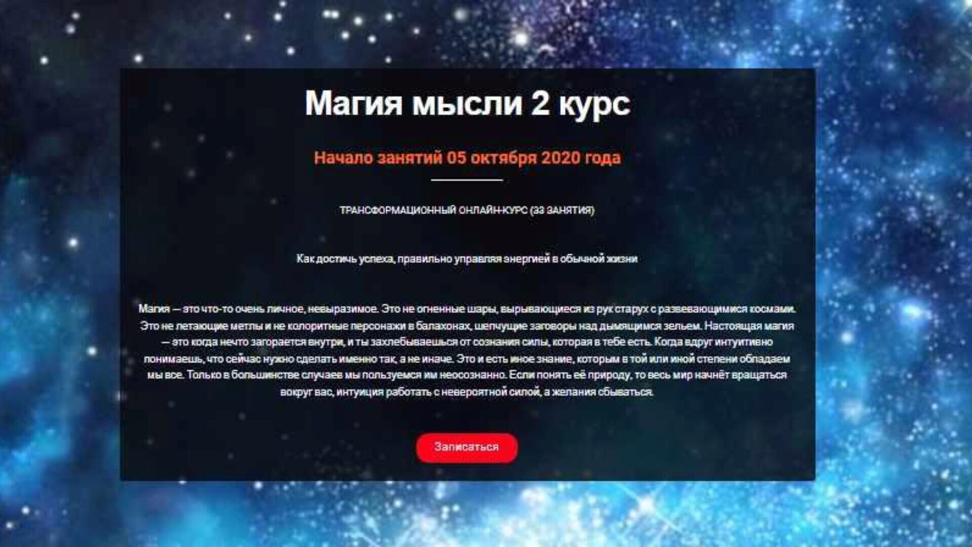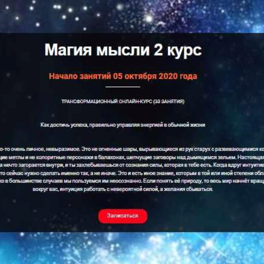 ПРАКТИЧЕСКИЙ ОНЛАЙН-КУРС (30 ЗАНЯТИЙ - полный курс) Здесь 1 ступень - 10 заянтий Магия Мысли Как достичь успеха, правильно управляя энергией в обычной жизни Наша жизнь — это решения, которые мы принимаем. Но все ли они были правильными? Получаете ли вы то, чего искренне хотите? Не всегда. Мы часто