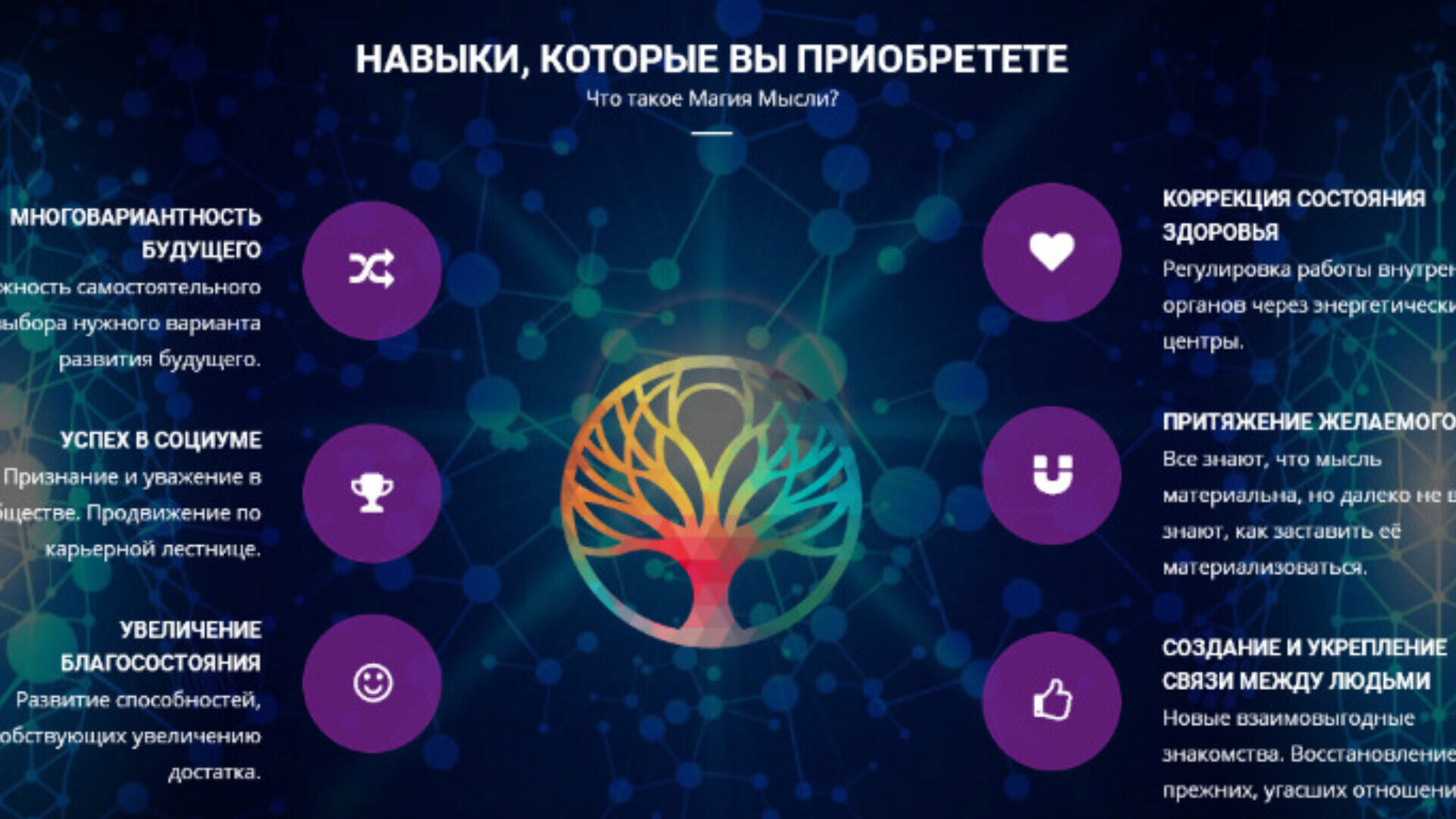 ПРАКТИЧЕСКИЙ ОНЛАЙН-КУРС (30 ЗАНЯТИЙ - полный курс) Здесь 1 ступень - 10 заянтий Магия Мысли Как достичь успеха, правильно управляя энергией в обычной жизни Наша жизнь — это решения, которые мы принимаем. Но все ли они были правильными? Получаете ли вы то, чего искренне хотите? Не всегда. Мы часто