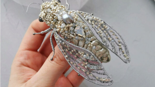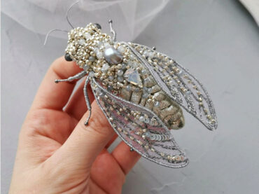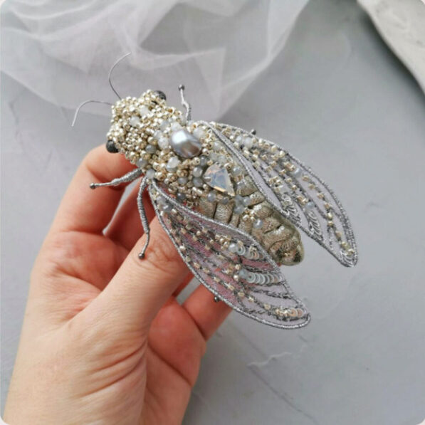 Каркасная брошь «Королевская Цикада», у которой гнуться и крылья и лапки, а так же она имеет прозрачные крылышки с натуралистическим рисунком, выглядит, как настоящая и живая цикада, что не оставляет равнодушными окружающих.