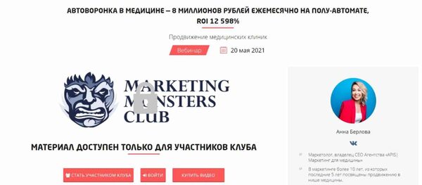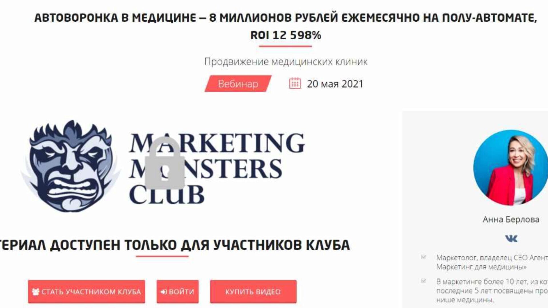 Анна Берлова «Автоворонка в медицине - 8 рублей миллионов рублей ежемесячно на полу-автомате. Запись вебинара.» — Convert Monster