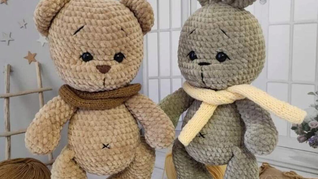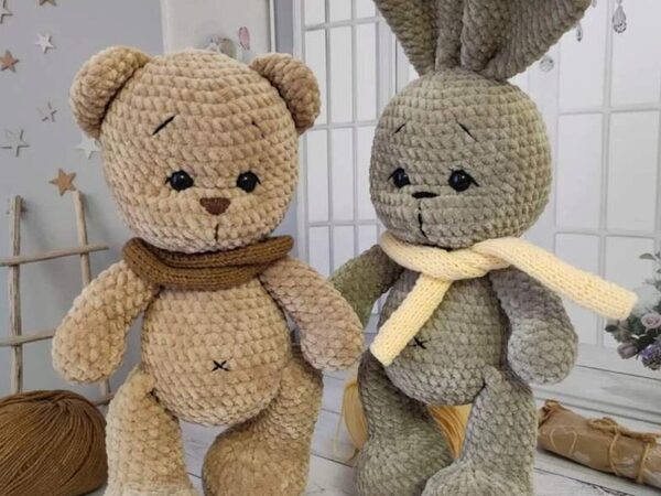описание вязания 3-х игрушек: зайки, мишки и котика;
