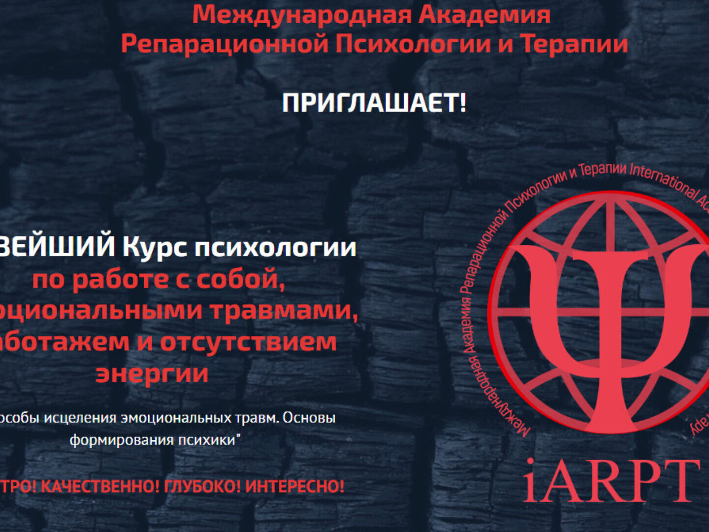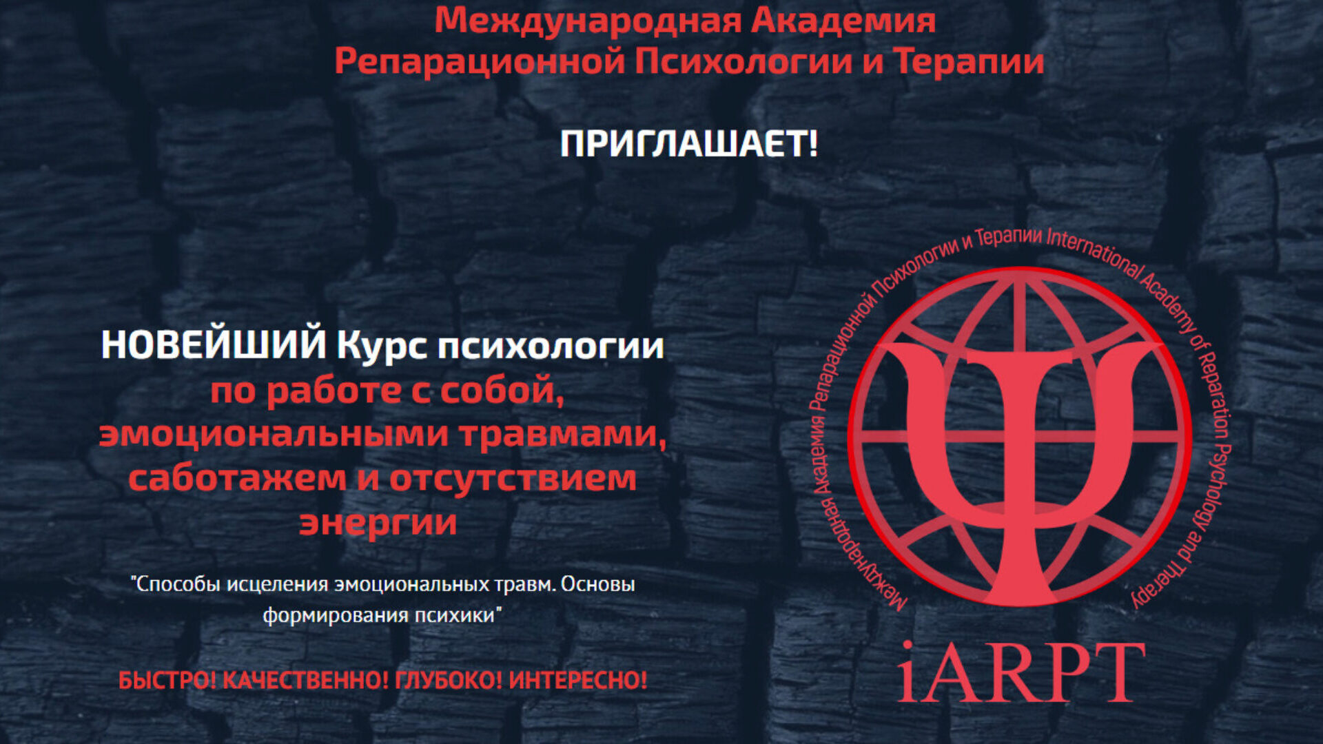 Обновленный курс. Начало нового обновленного потока в 2022. УНИКАЛЬНЕЙШИЙ курс по работе с эмоциональными травмами, саботажем, отсутствием энергии, аналогов которому НЕ СУЩЕСТВУЕТ! Все 6 модулей обучения. В Международной Академии Репарационной Психологии и Терапии вы можете получить уникальную