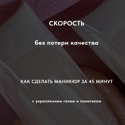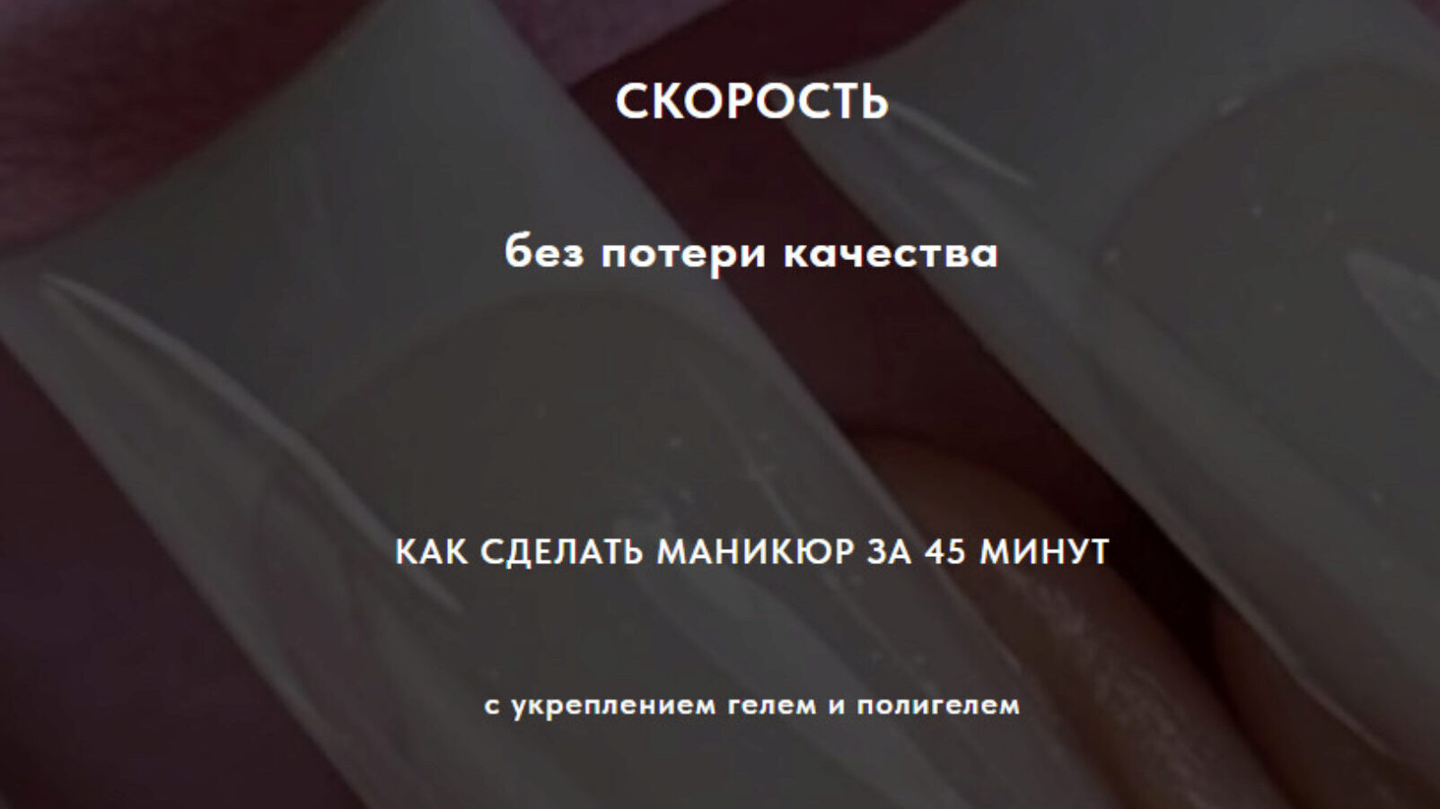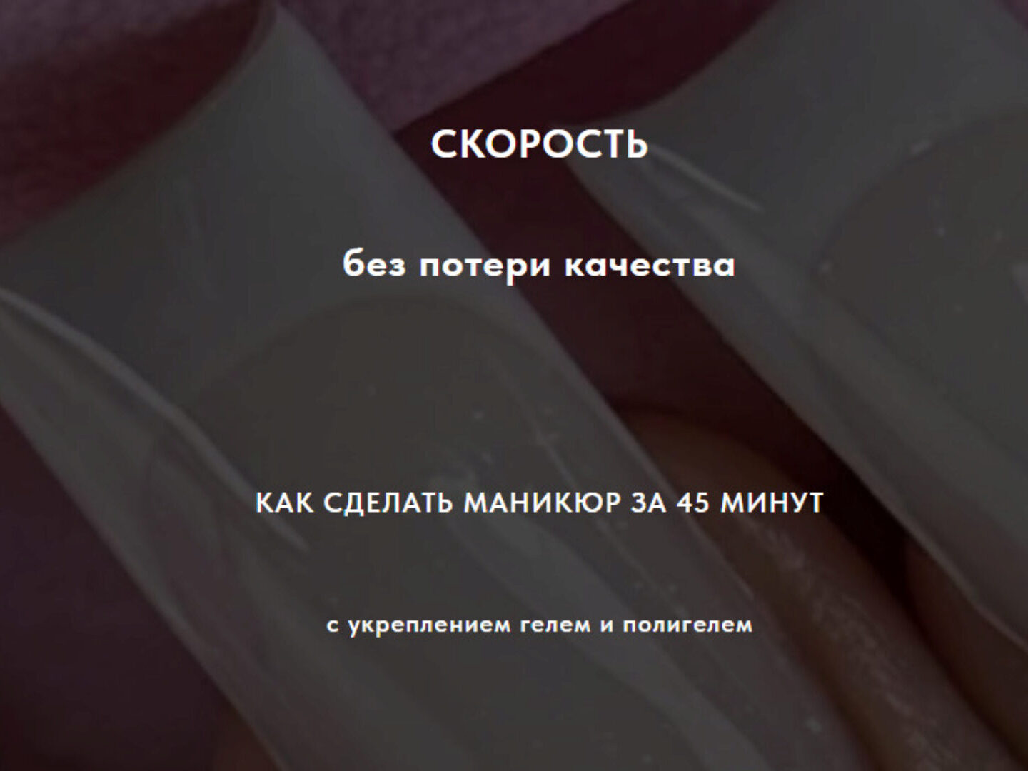 Курс по скорости без потери качества от супер скоростного мастера(рекорд-26 минут с гелем) подойдёт: мастерам, которые не понимают как ускориться мастерам, которые хотят освоить новую технику работы мастерам, у которых нет чёткого алгоритма работы После прохождения курса вы: избавитесь от лишних