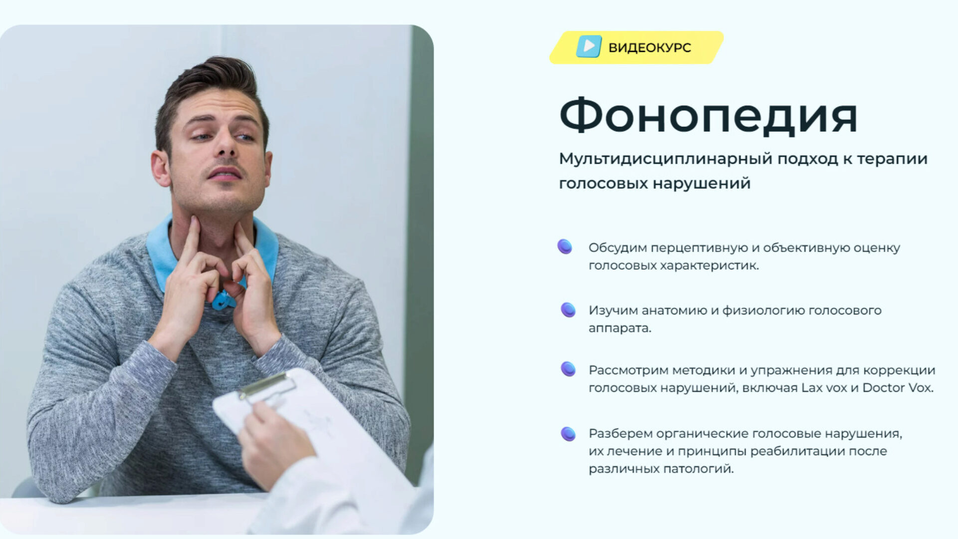 Слушатели получат возможность изучить и отработать упражнения и методики, такие как Lax vox и Doctor Vox терапия, что повысит их эффективность в терапии голосовых нарушений.