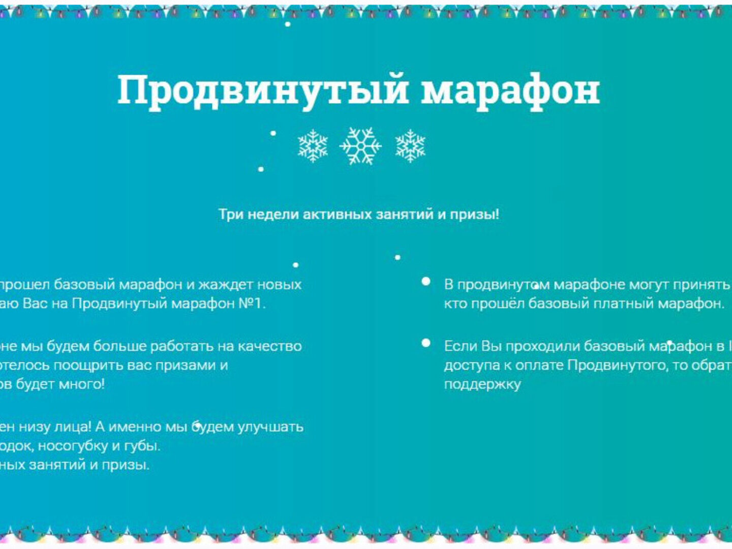 На обновленном марафоне детально прорабатывается 3 блока: 1. Спина - 10 упражнений 2. Шея - 5 упражнений 3. Лицо Кожа головы - 4 упражнения Подбородок - 4 упражнения Овал - 5 упражнений Носогубка - 3 упражнения Губы - 3 упражнения Лоб - 4 упражнения Межбровка - 6 упражнения Глаза - 6 упражнения На