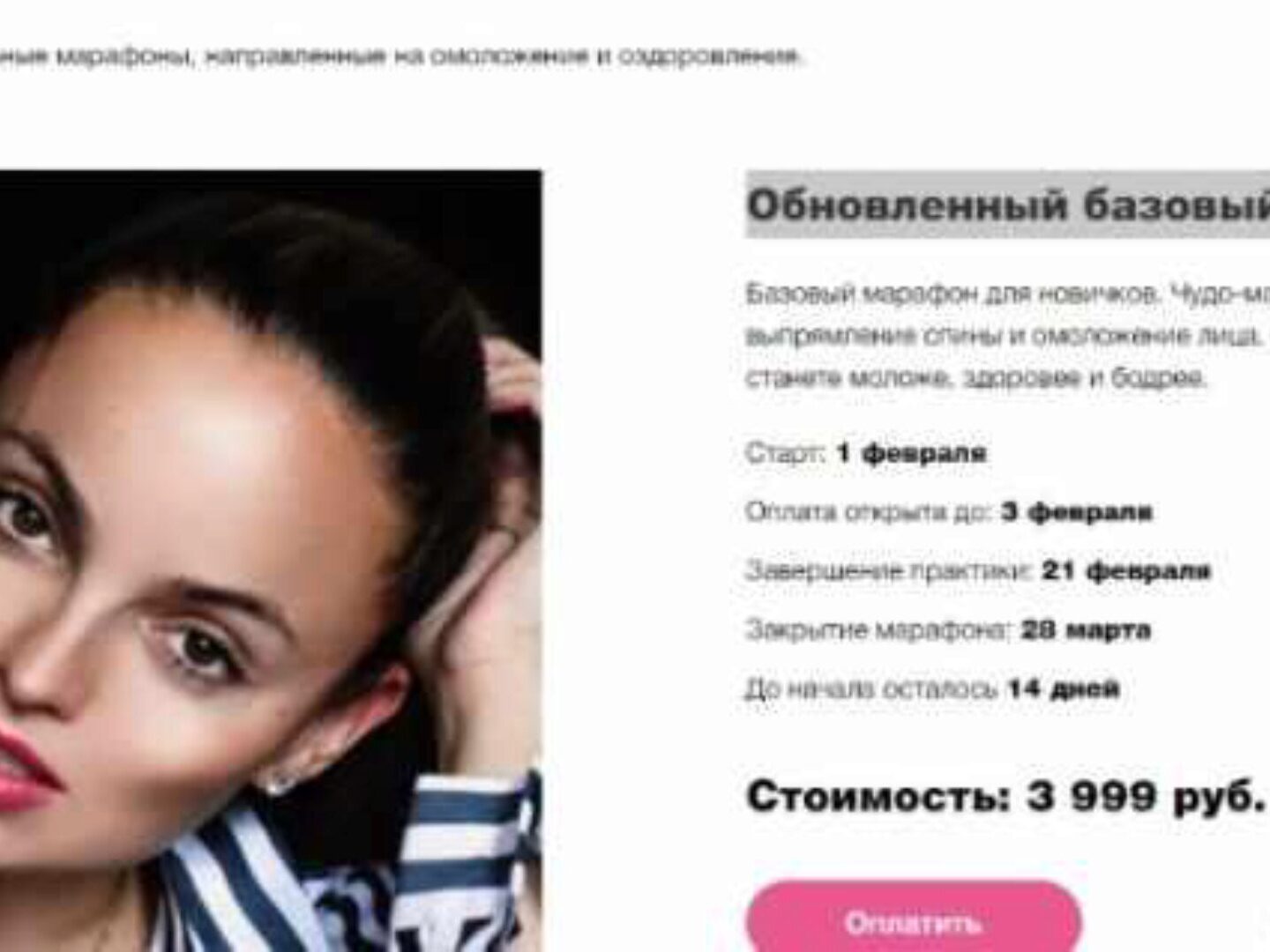 Старт: 25.07.2022 Легендарный БАЗОВЫЙ МАРАФОН лёг в основу всех марафонов красоты, которые уже прошли более 500 000 человек. Это мощный курс по экспресс восстановлению здоровой спины! Выправим осанку и плечи, уберем зажимы грудной клетки, позвоночника, поработаем с отечностью, чтобы продлить