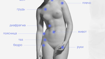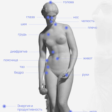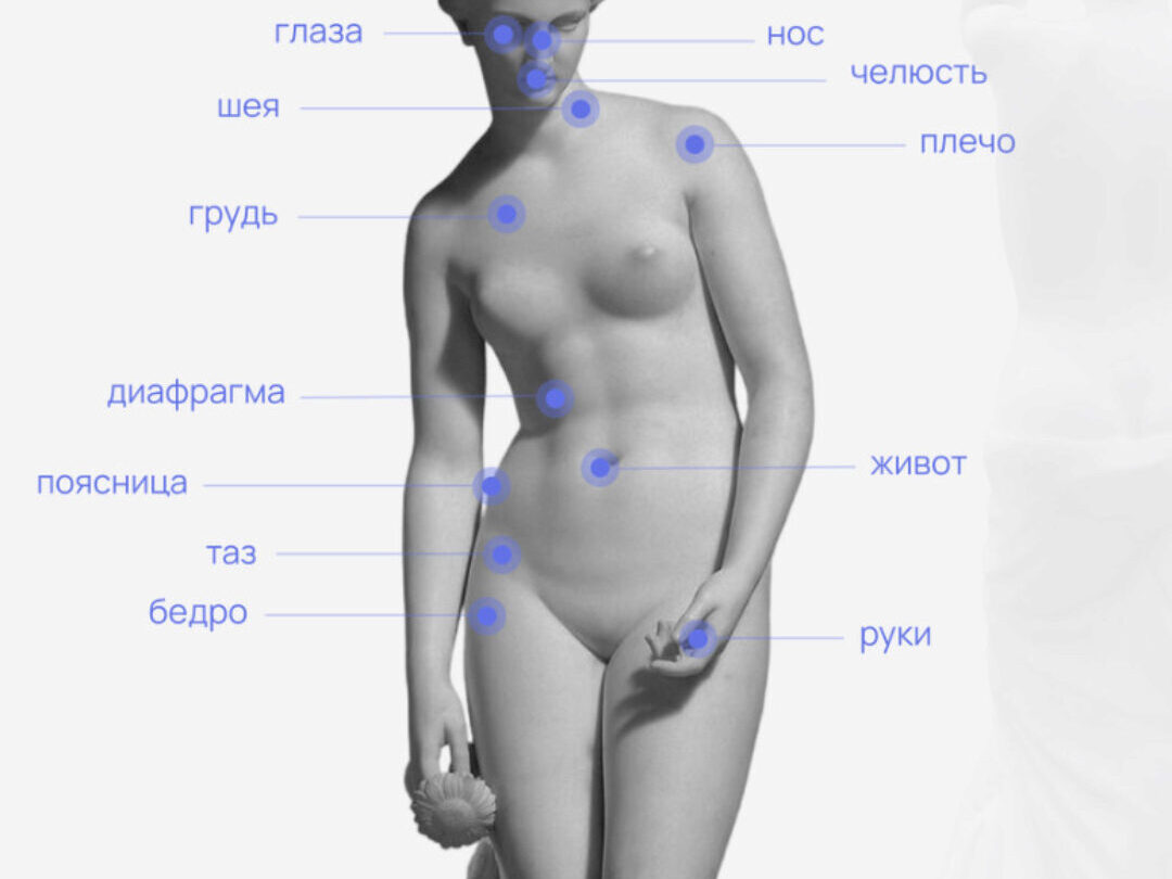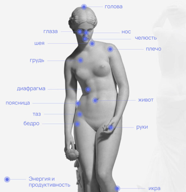 — быстрая навигация: нажимаете на часть тела, которую хотите проработать и получаете практики или упражнения, подробную инструкцию с фото